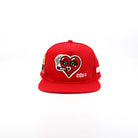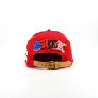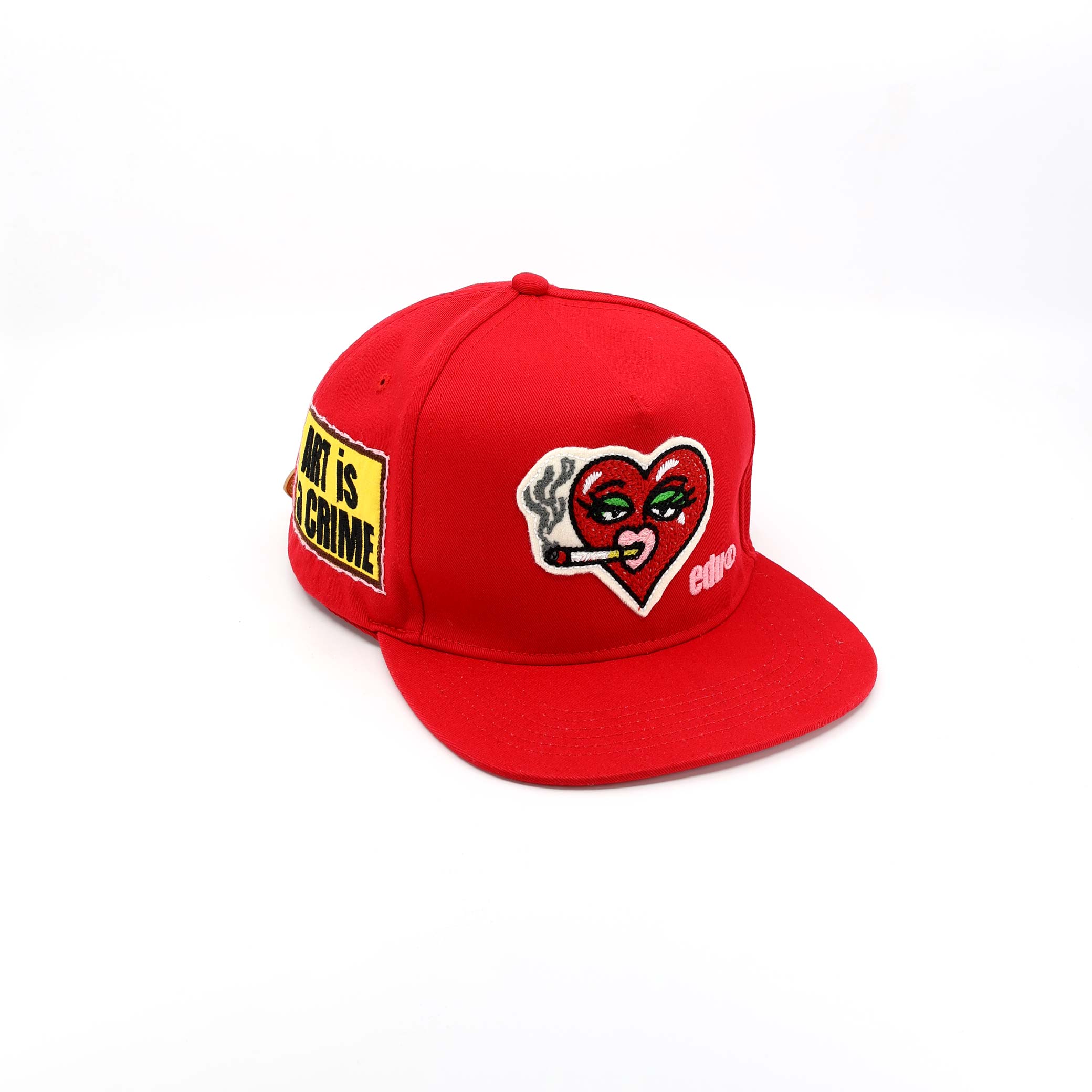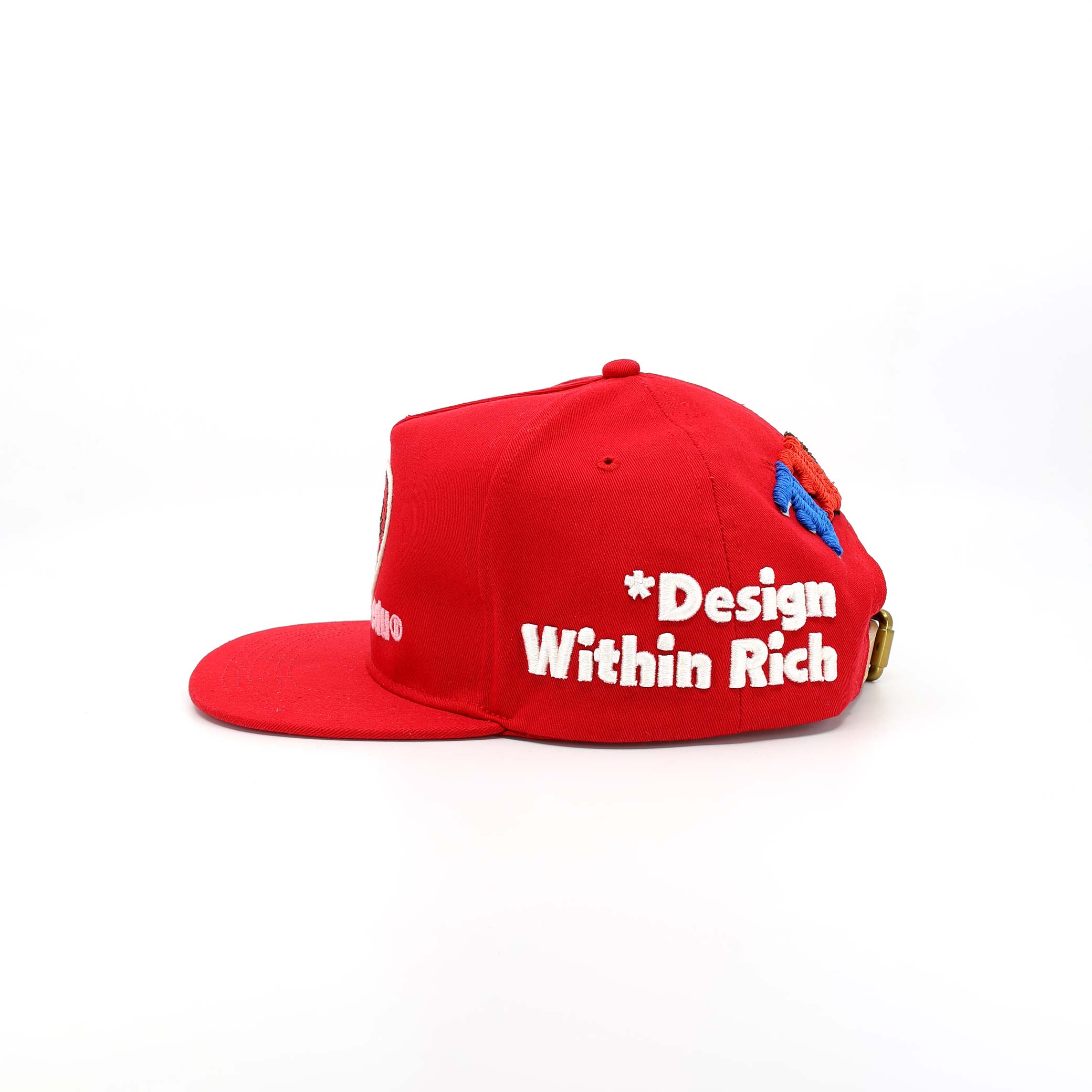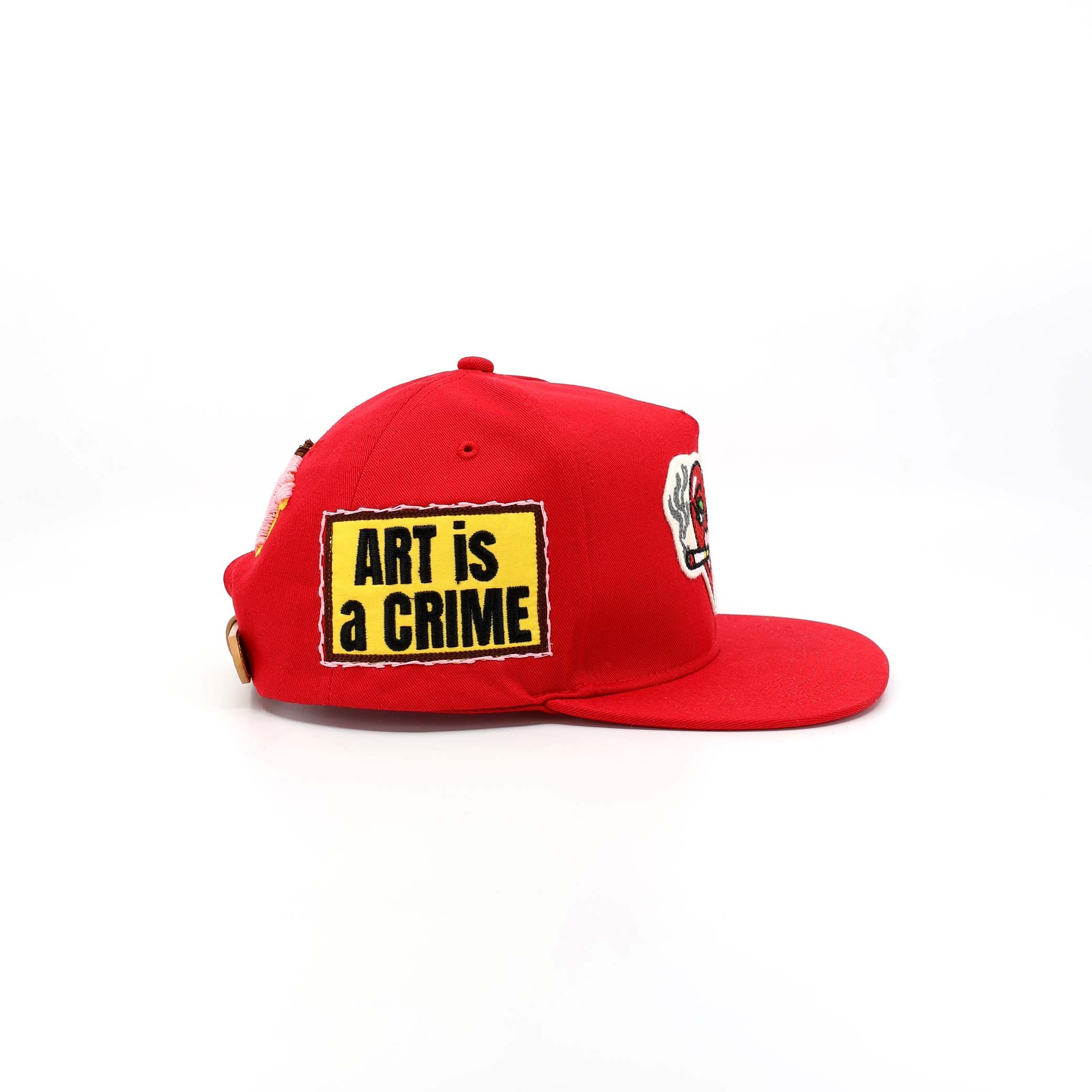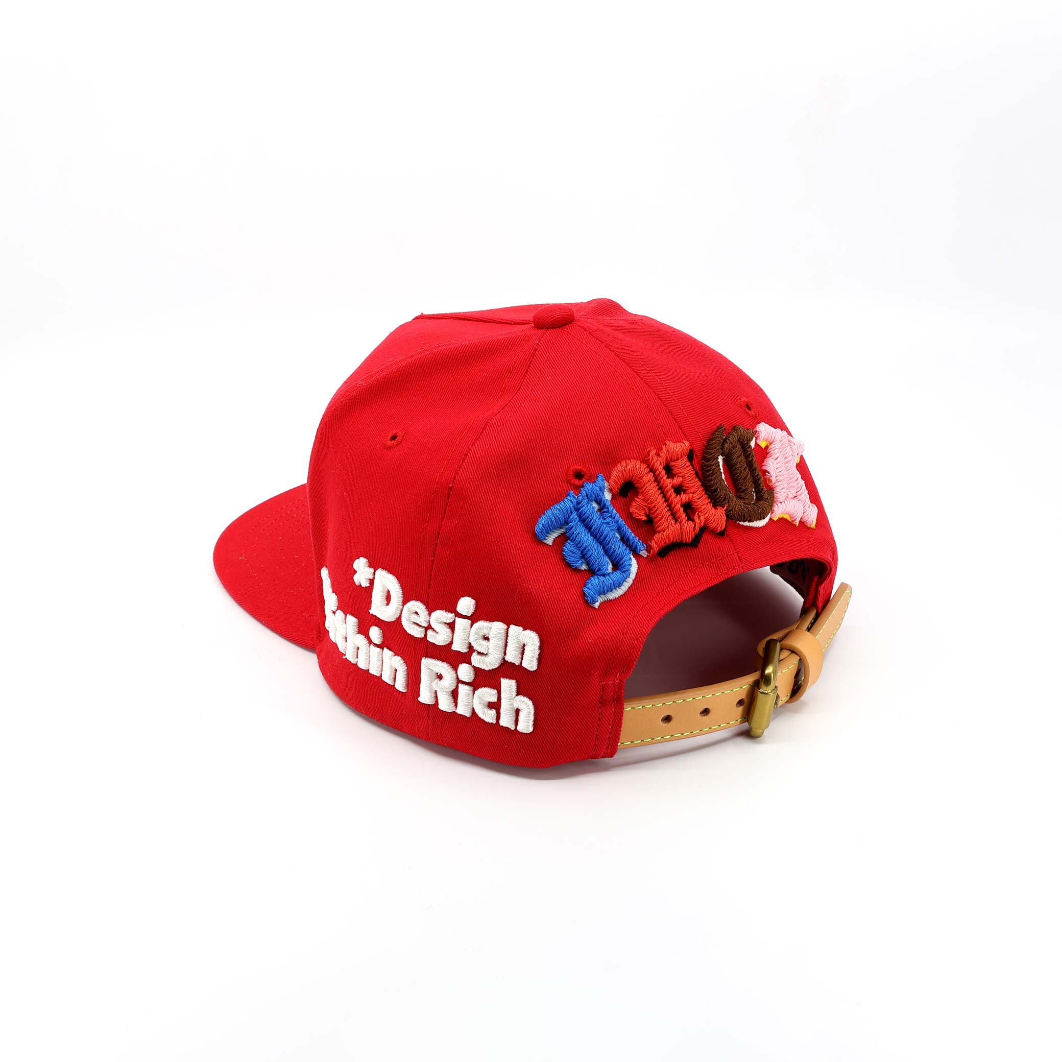 The combination of wool appliqué, multi-color raised embroidery, and patch elements creates layered texture across the entire cap.