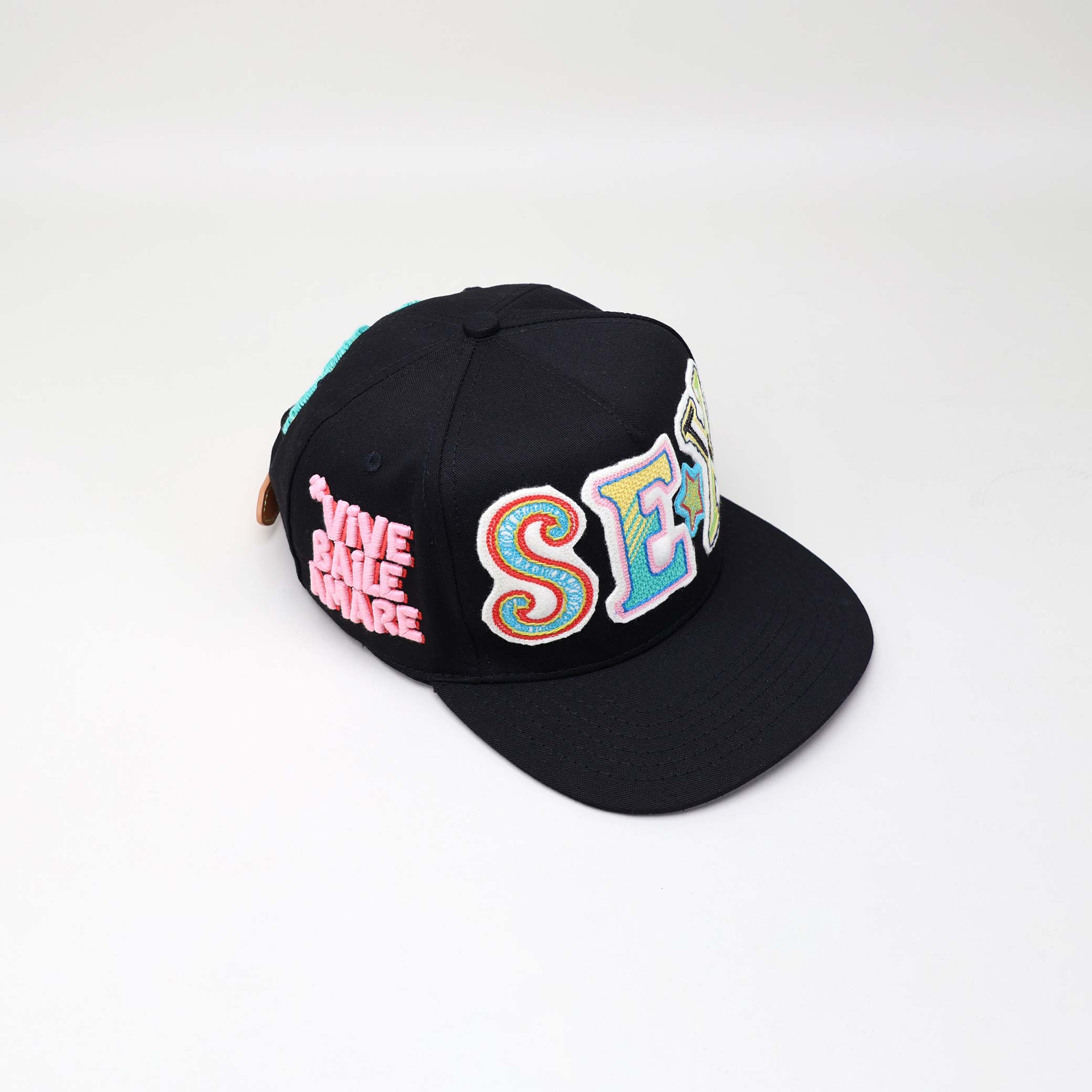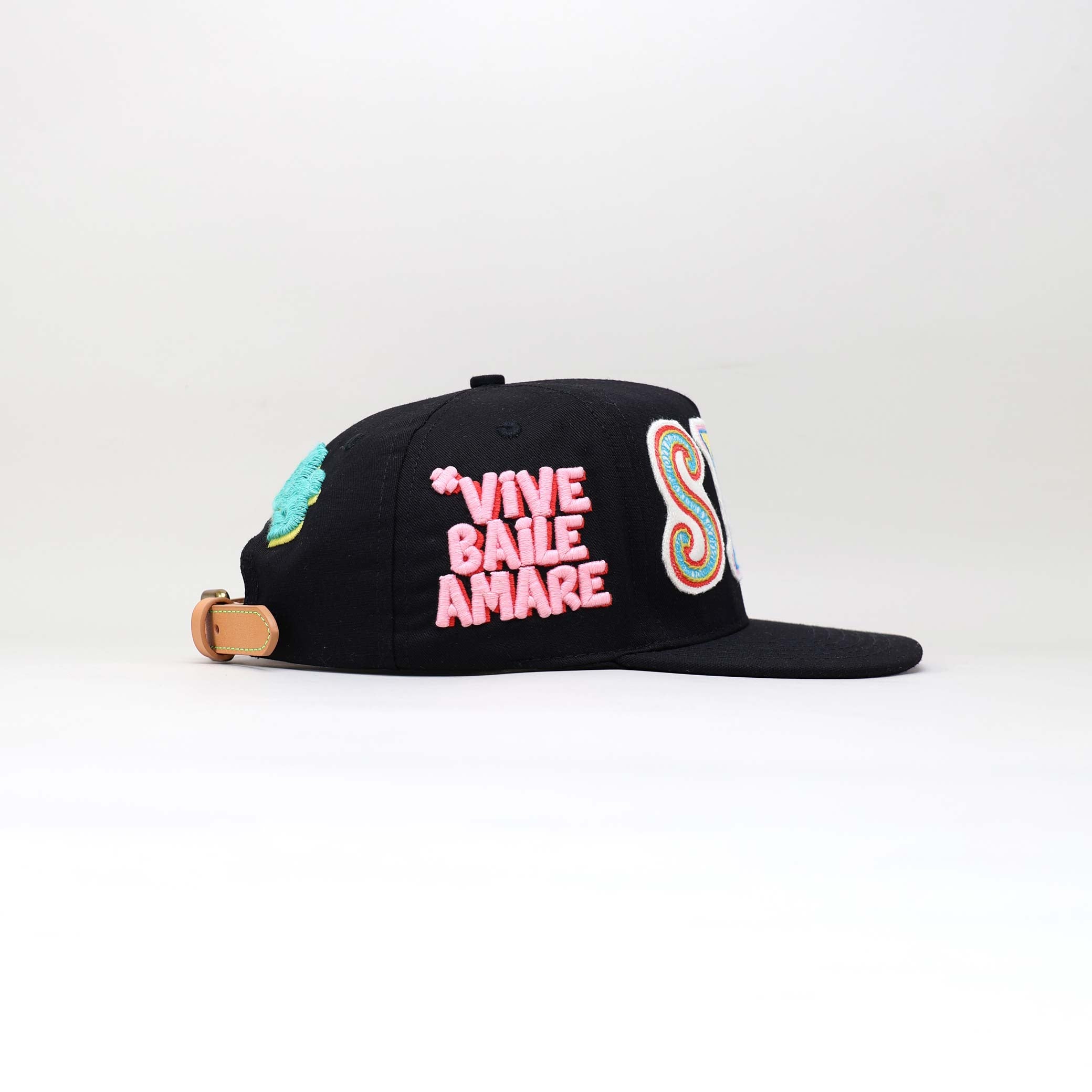 Raised pink embroidery: “VIVE BAILE AMARE.”
