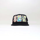 S★E→X lettering in multi-layer wool appliqué and raised-thread embroidery.
