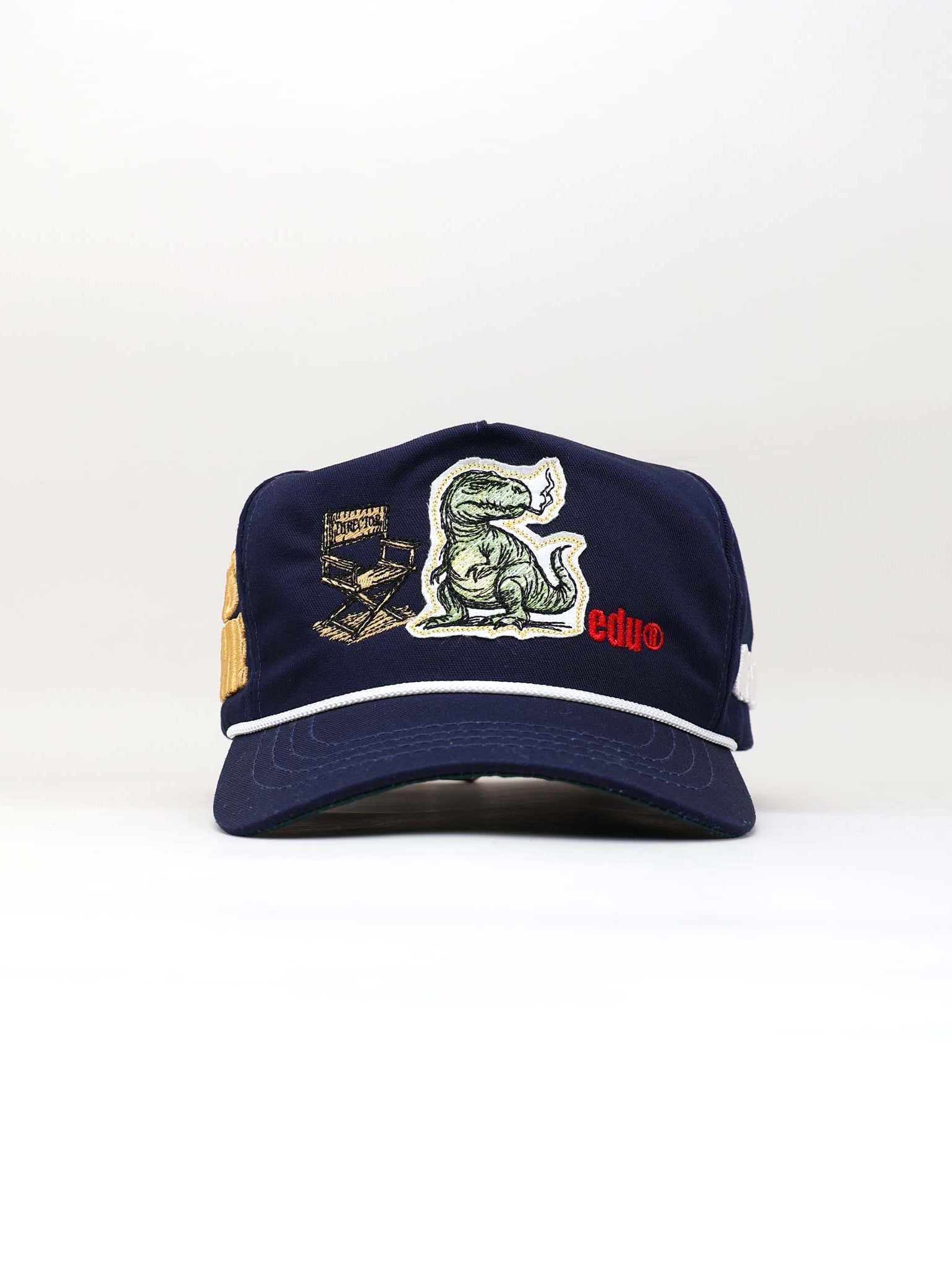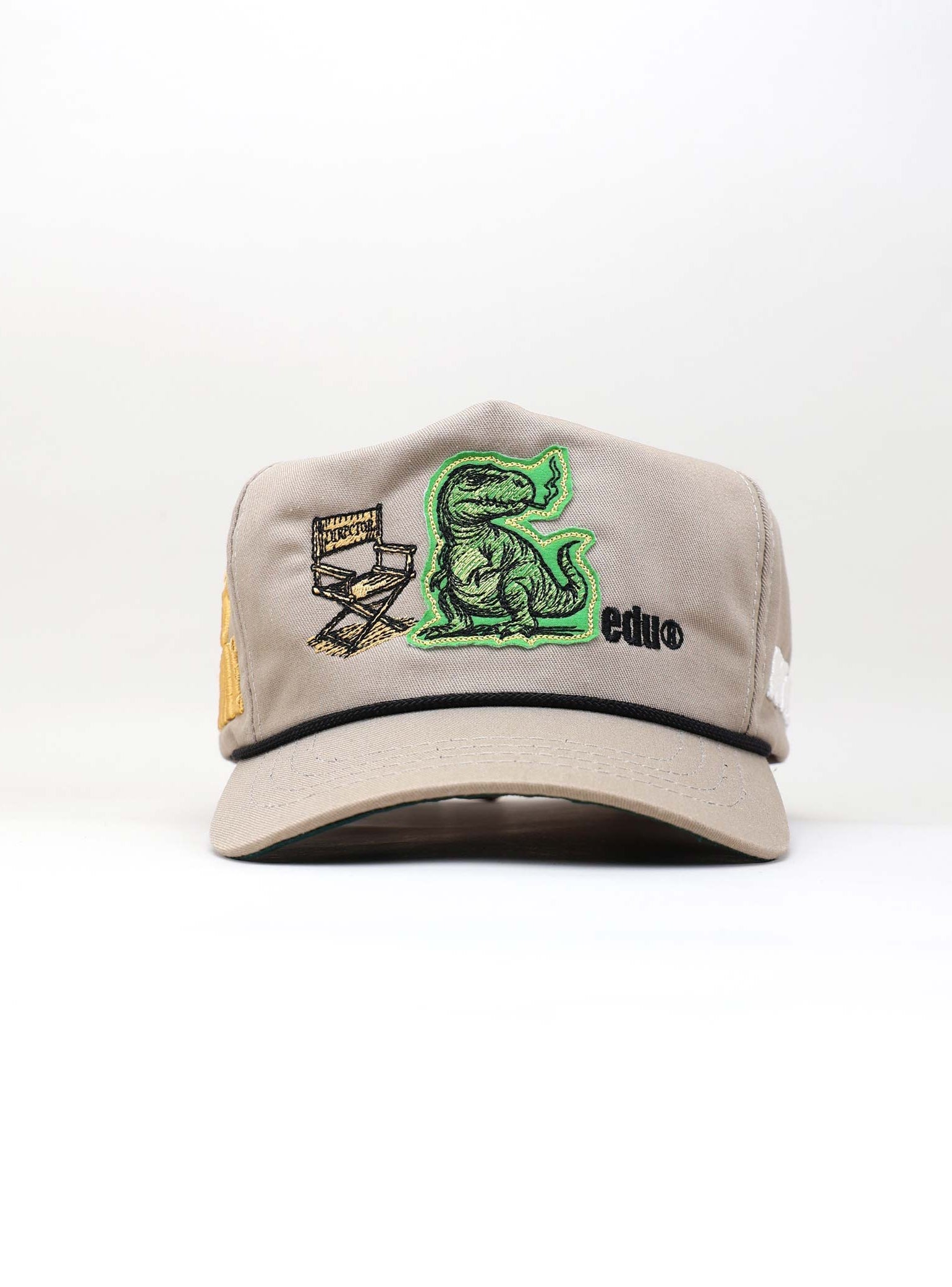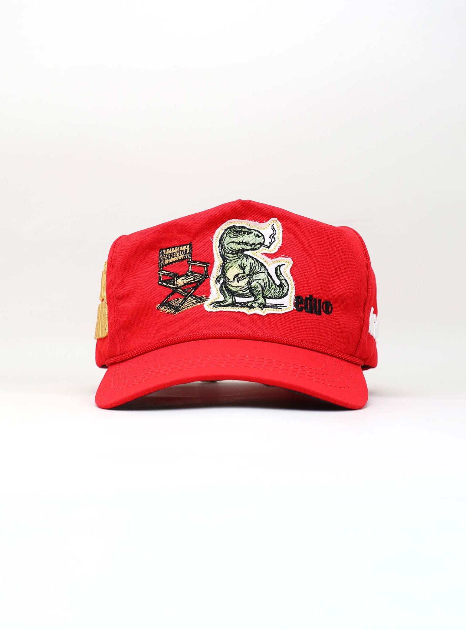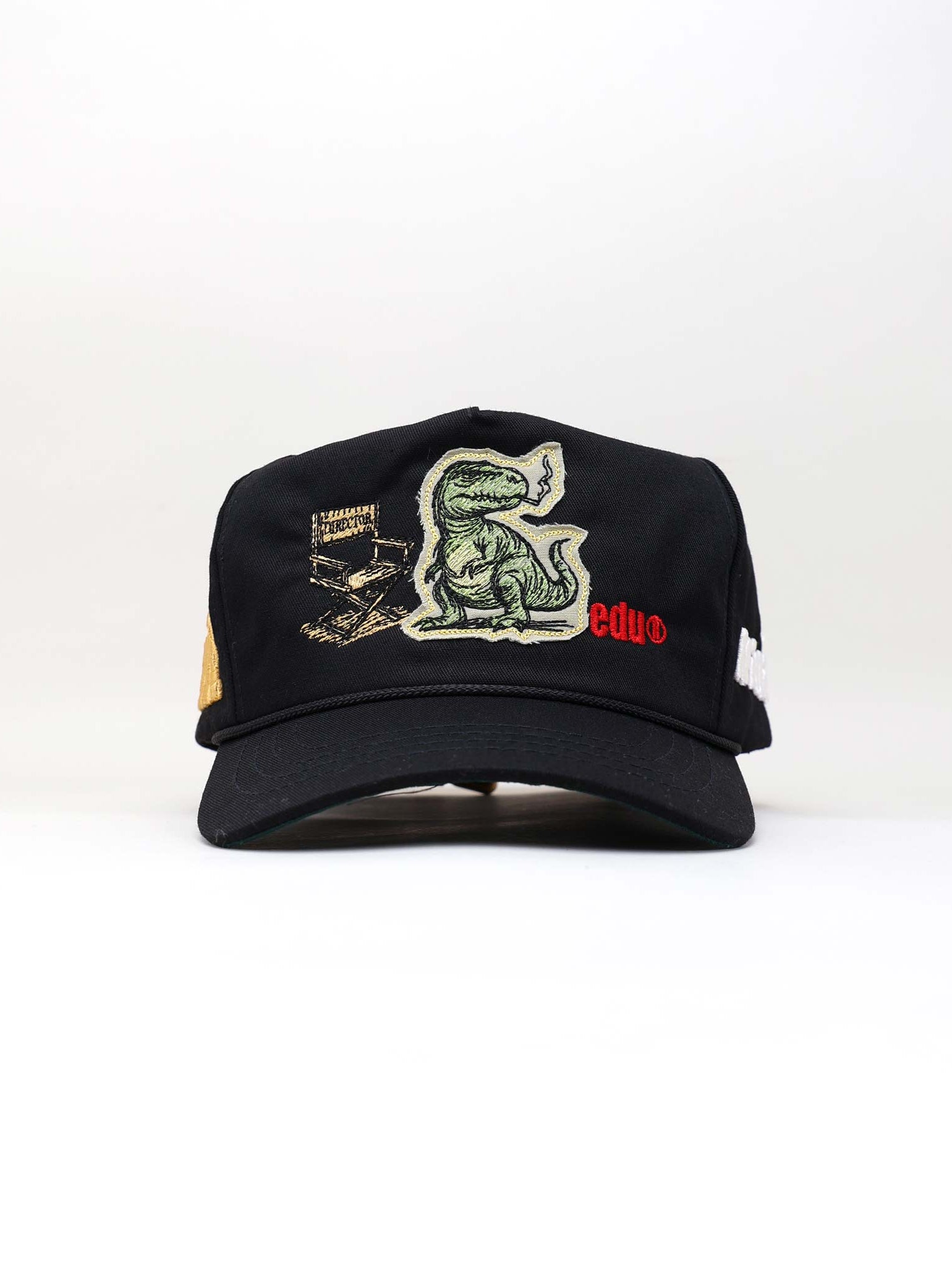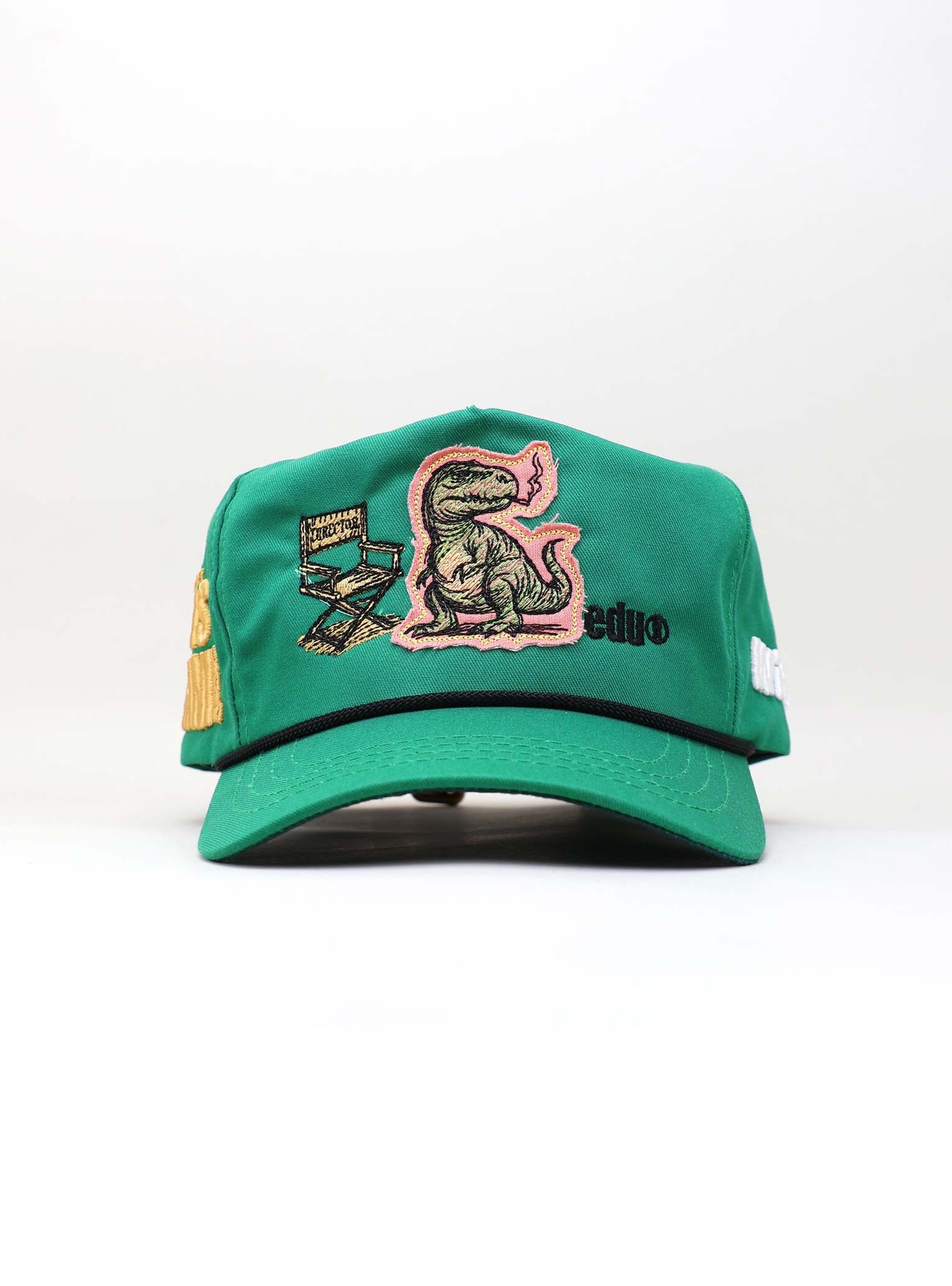 The front of the cap brings a cinematic scene to life through layered embroidery. At the center, a T-Rex confidently sits beside a detailed director’s chair labeled “MIH™ HUMAN AGENCY,” as if orchestrating the creative chaos. Behind the scene, diagonal green stripes add movement and energy, while the bold word “HUMAN” anchors the message on the right. Below, the *edu logo appears in vivid red, stamped like an artist’s signature, grounding the piece in creative identity and attitude.