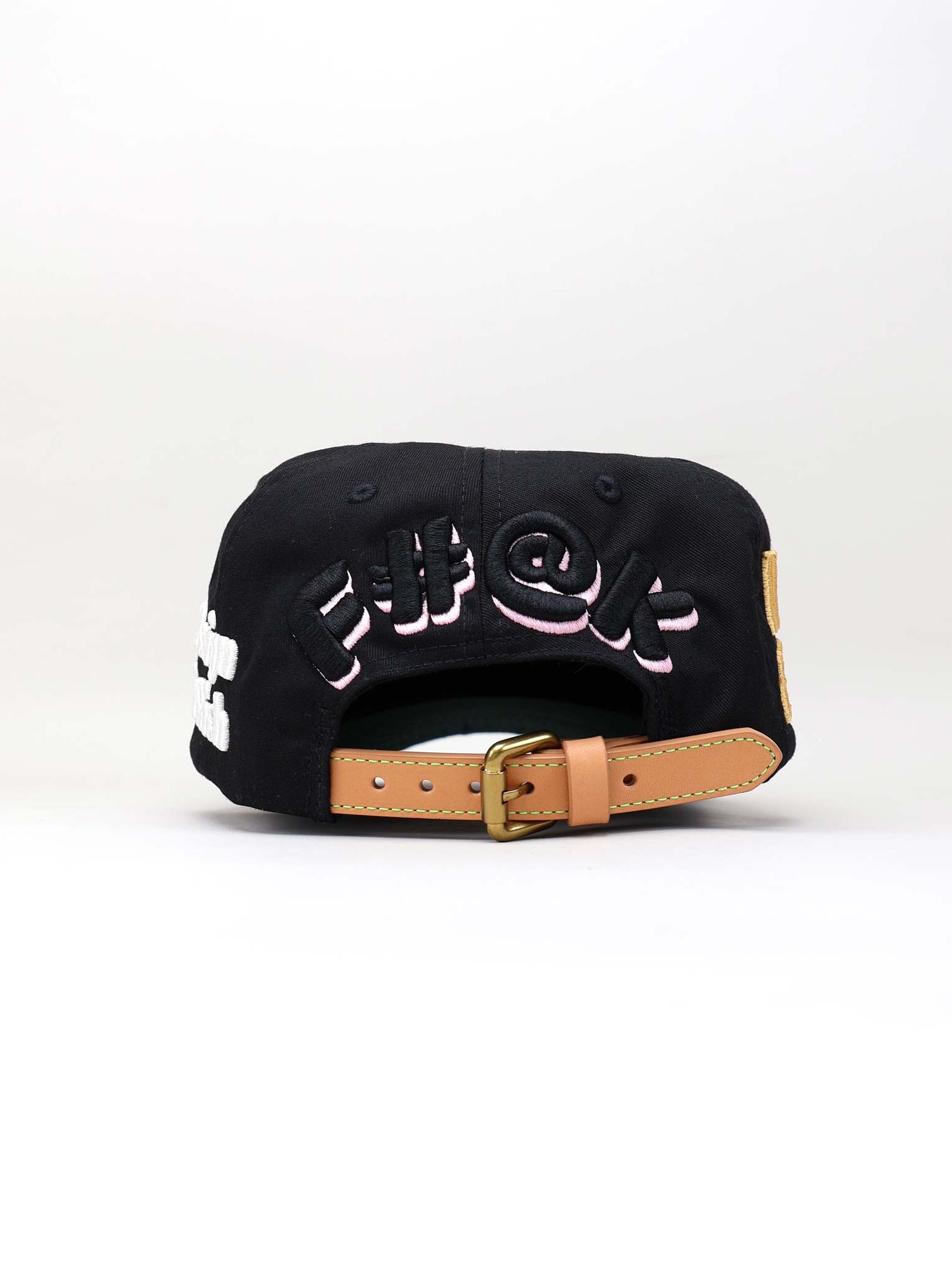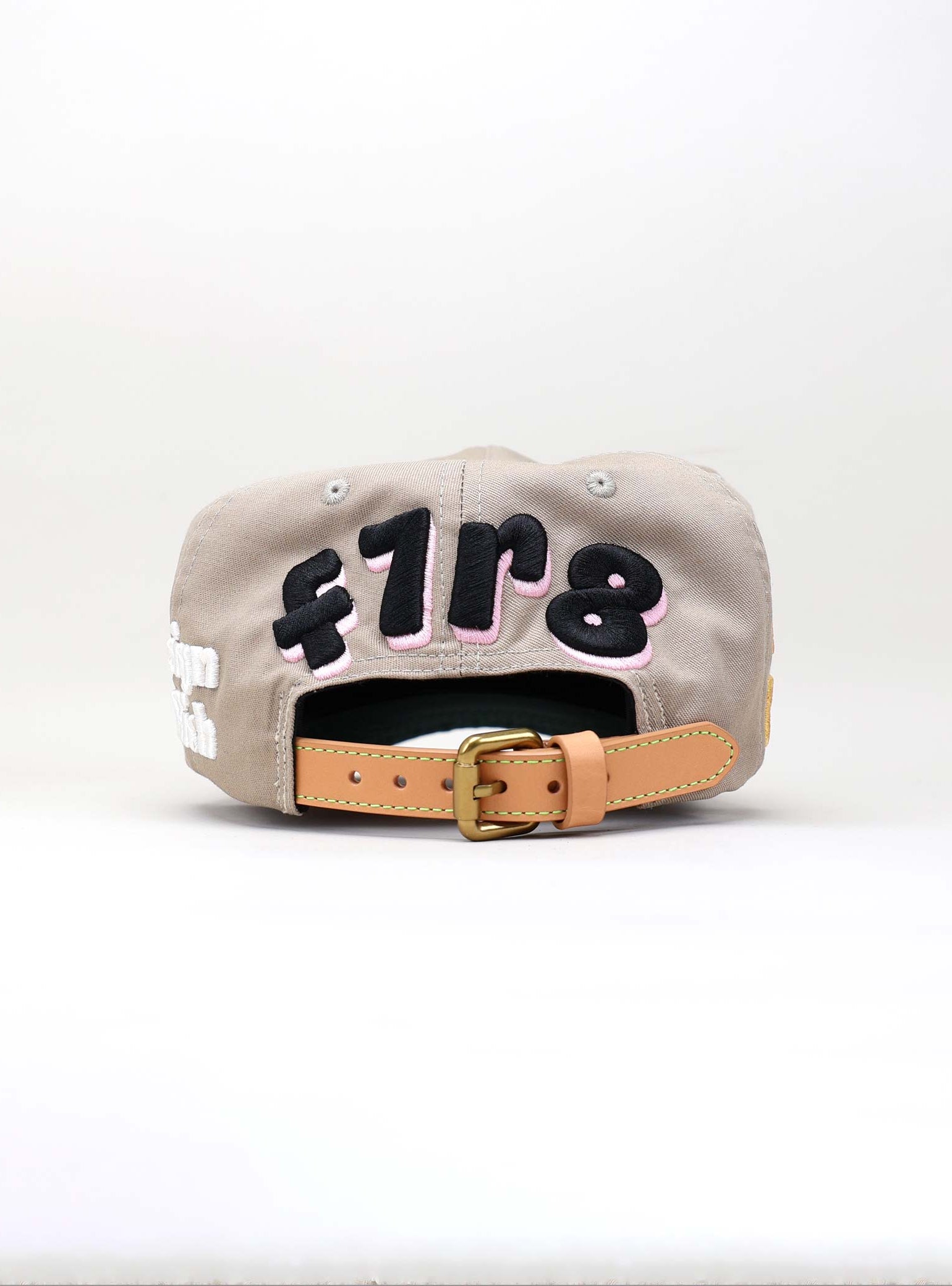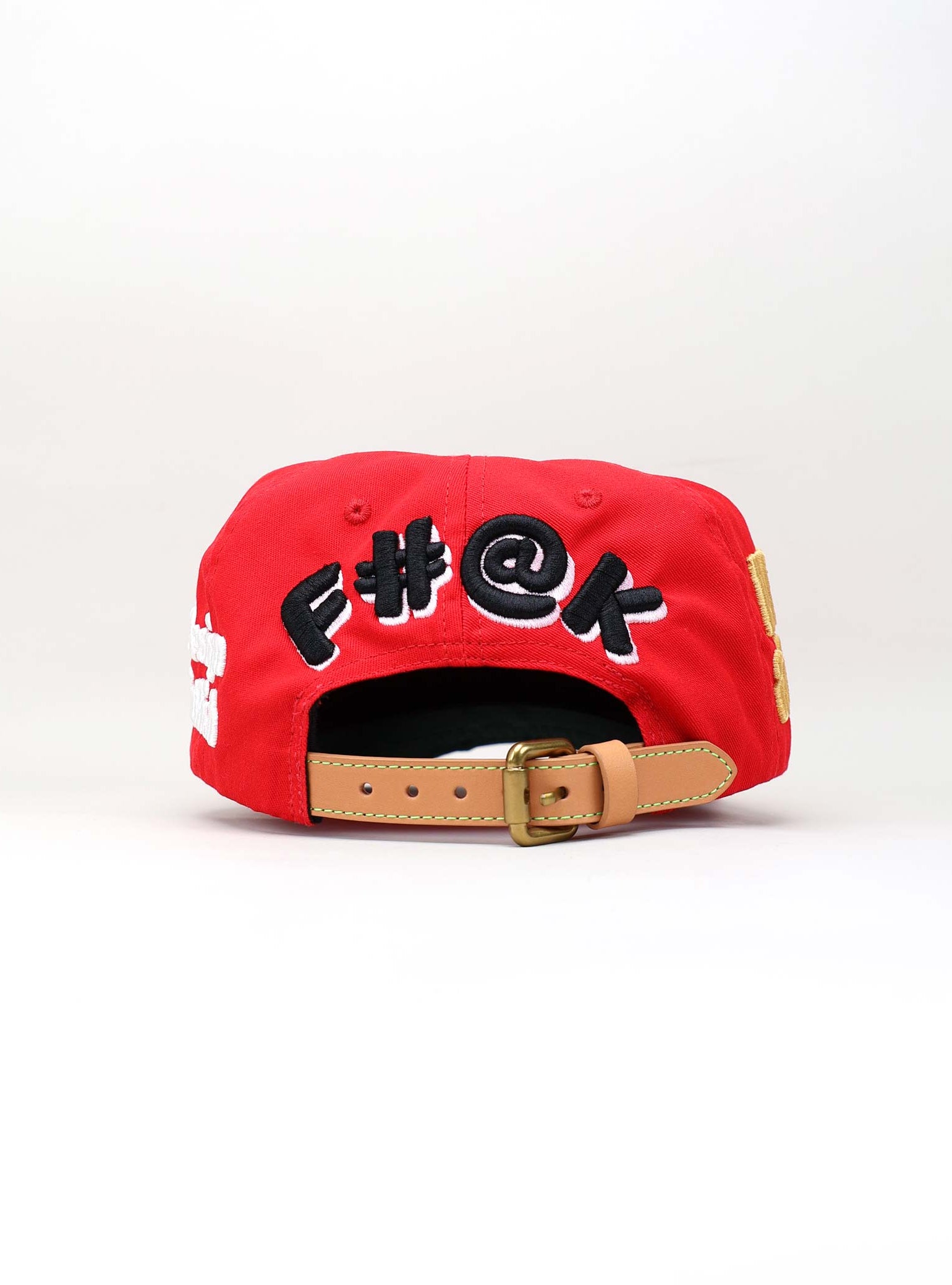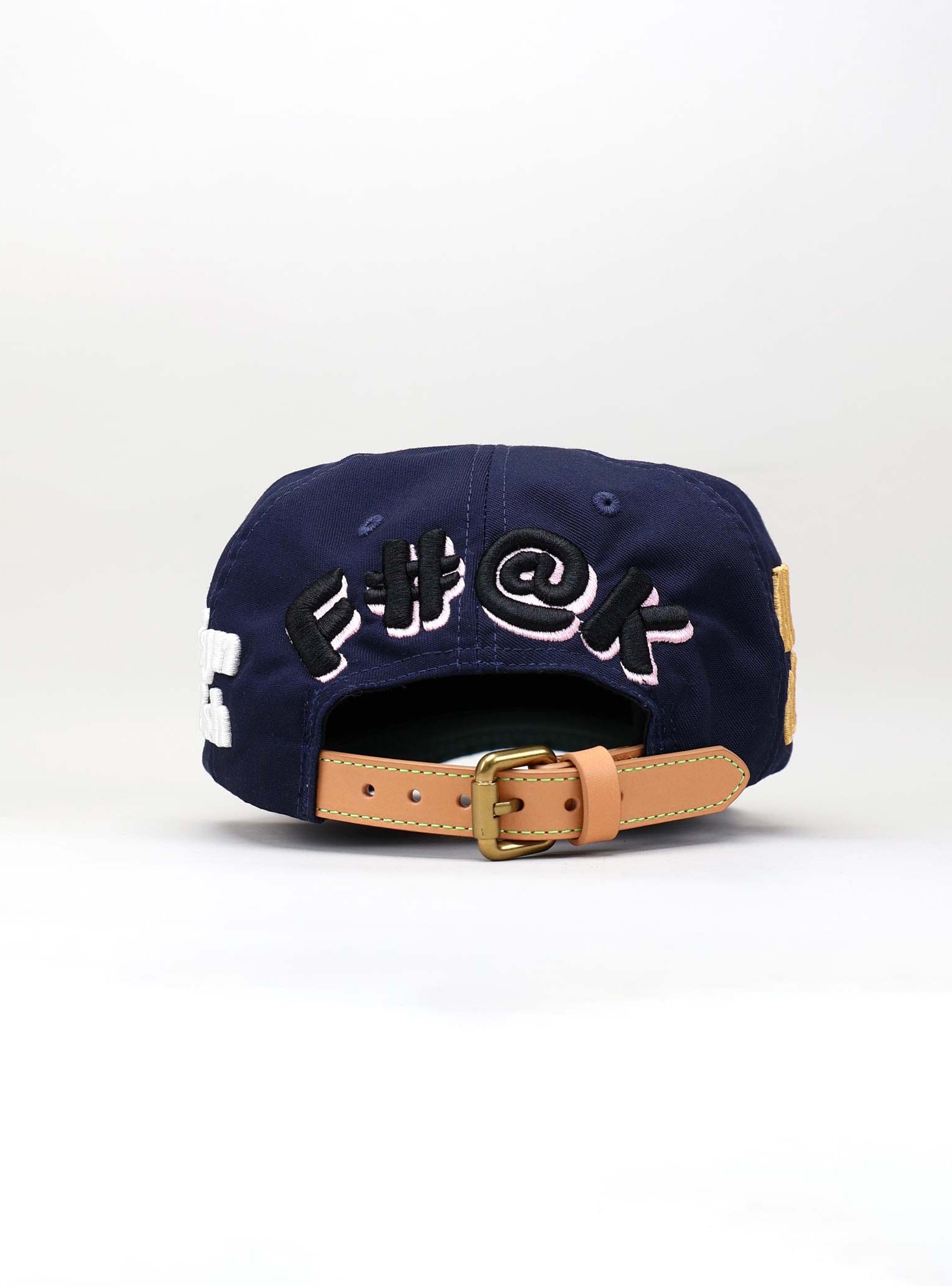 The cap is completed with a natural full-grain leather strap and brass buckle. The soft beige tone of the strap adds a refined vintage feel that balances the bold graphics, delivering a product that merges craftsmanship with creative defiance.