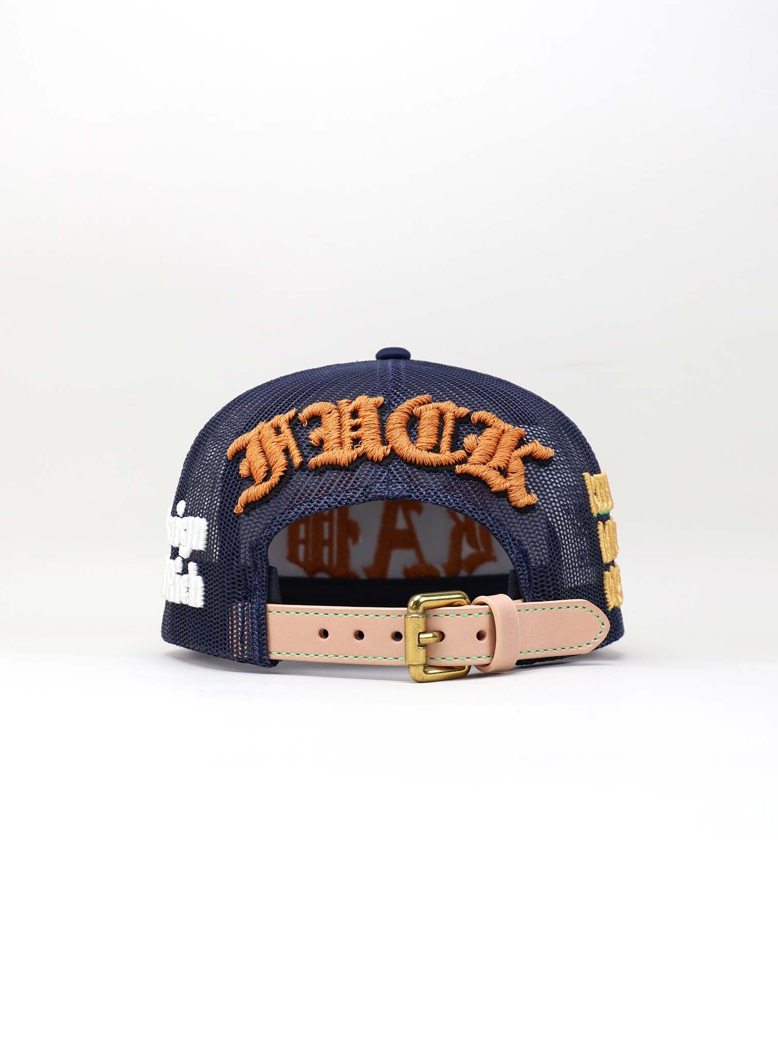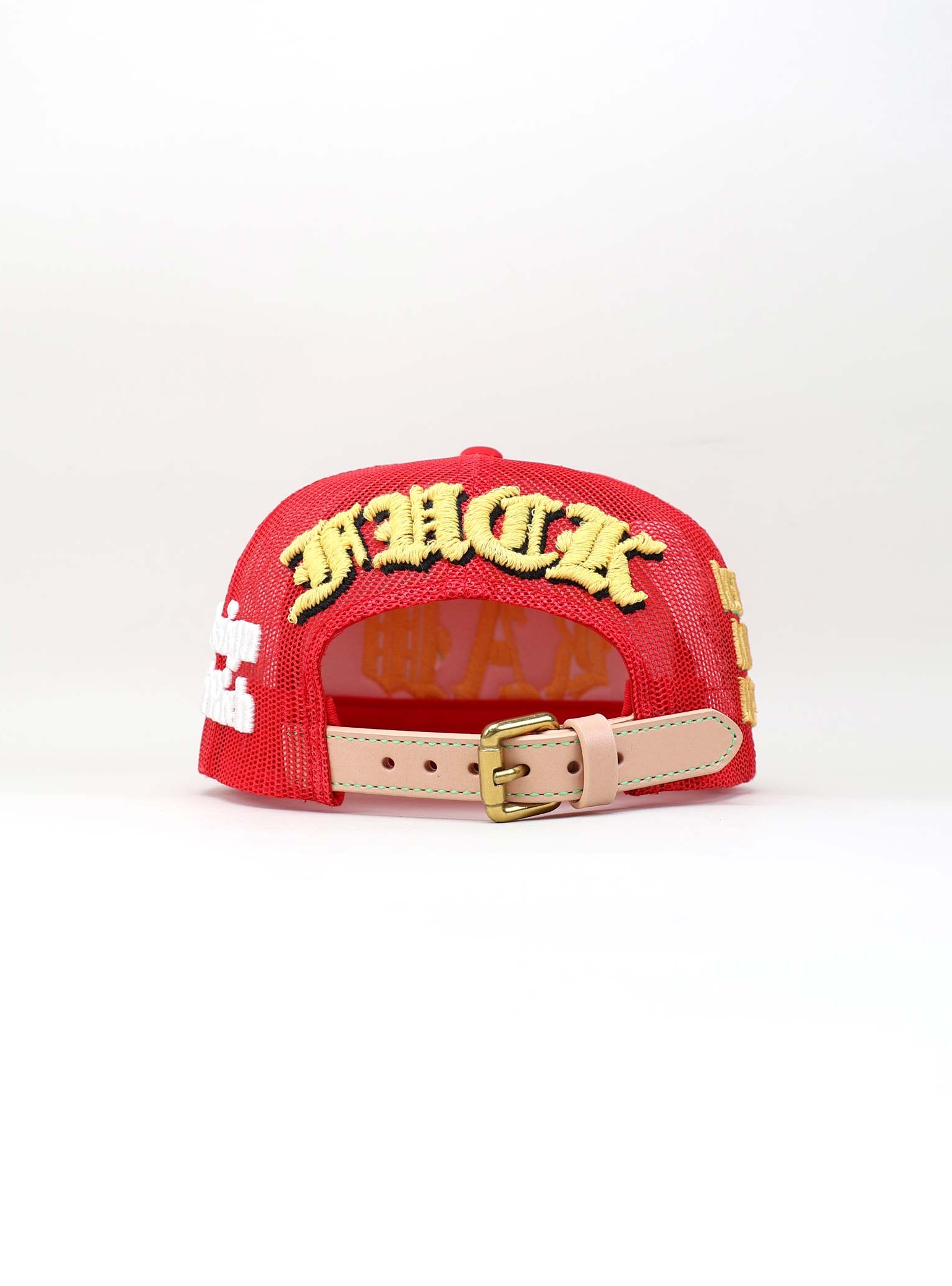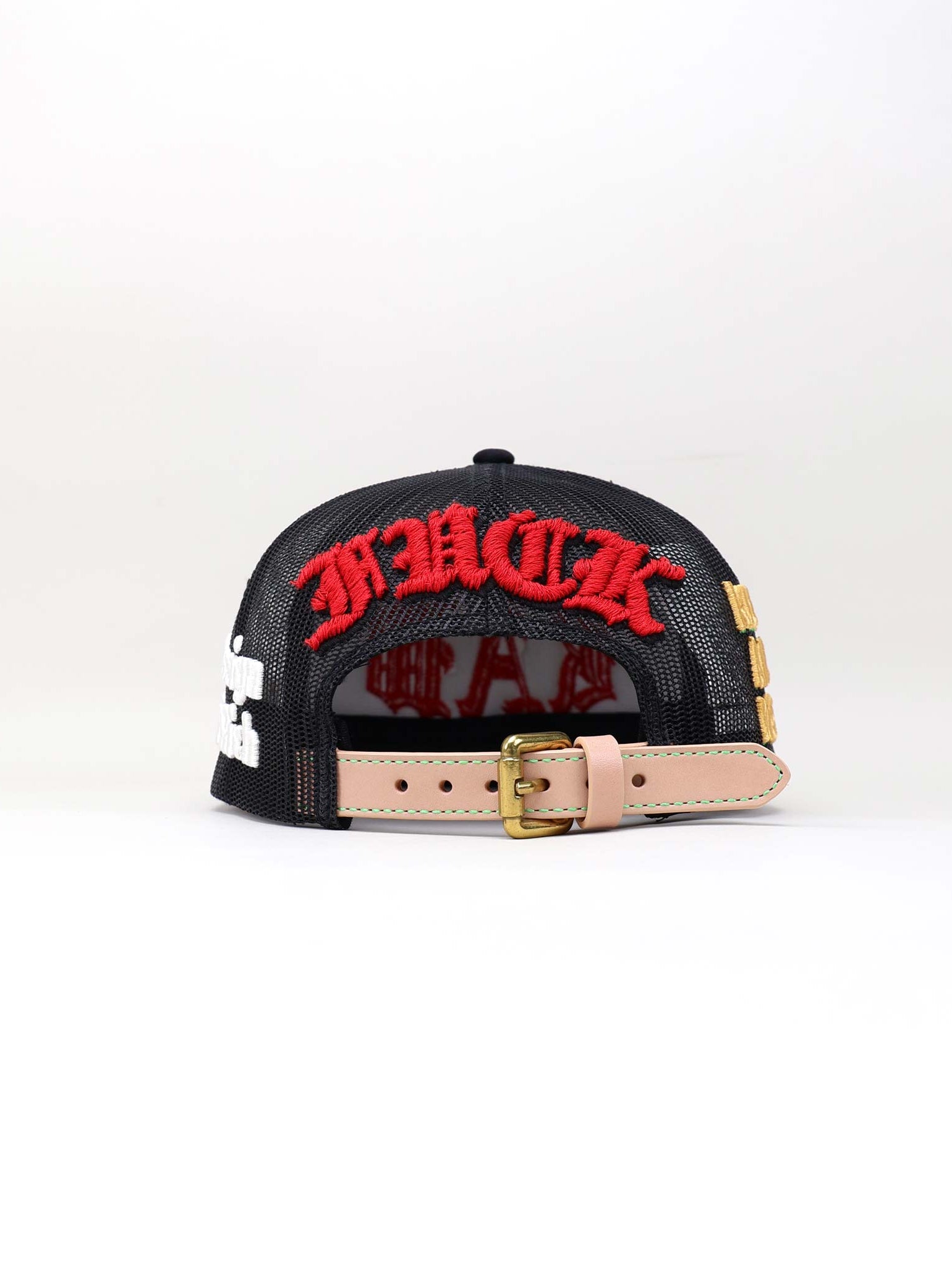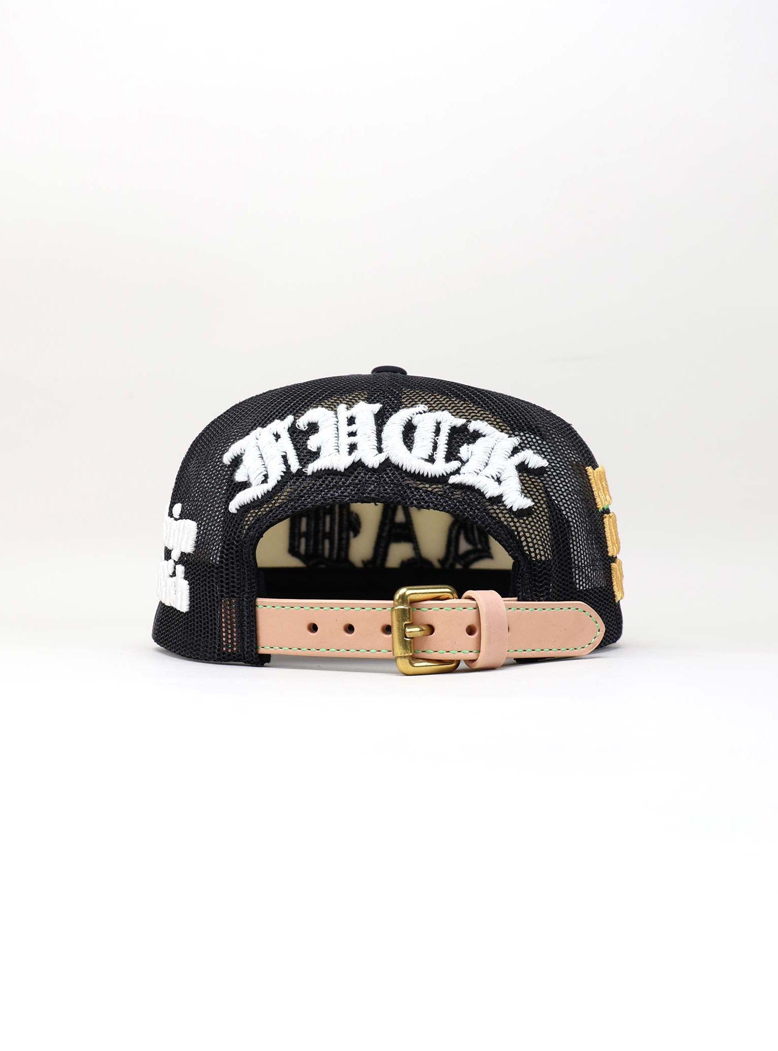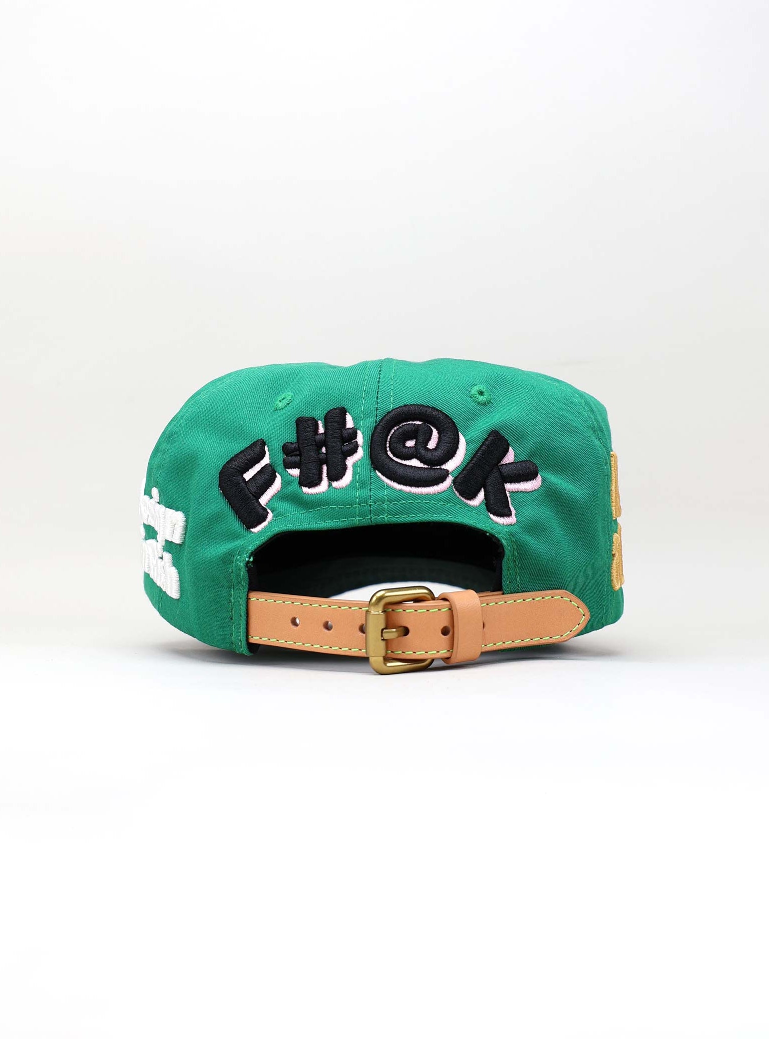 The cap is completed with a natural full-grain leather strap and brass buckle. The soft beige tone of the strap adds a refined vintage feel that balances the bold graphics, delivering a product that merges craftsmanship with creative defiance.