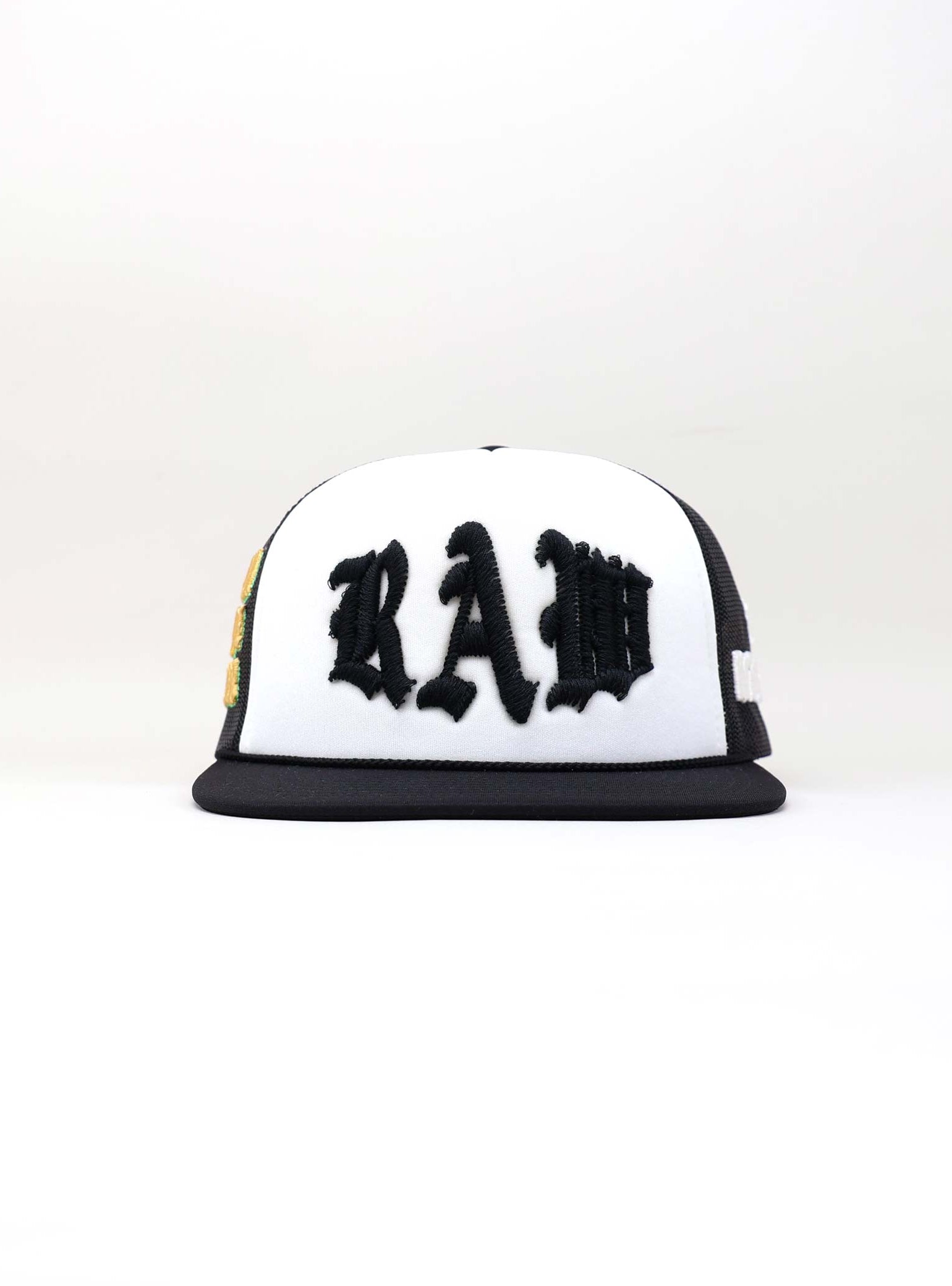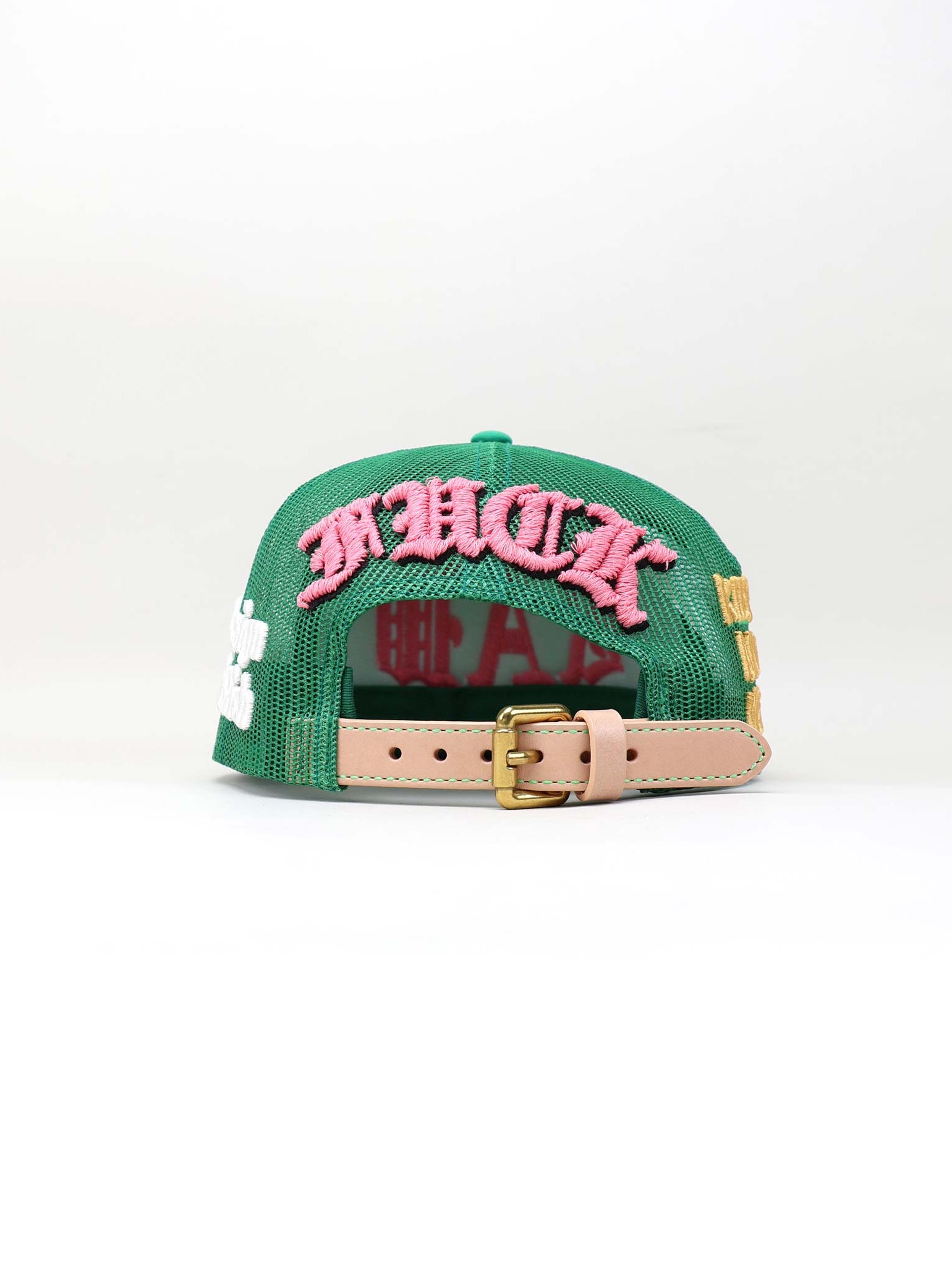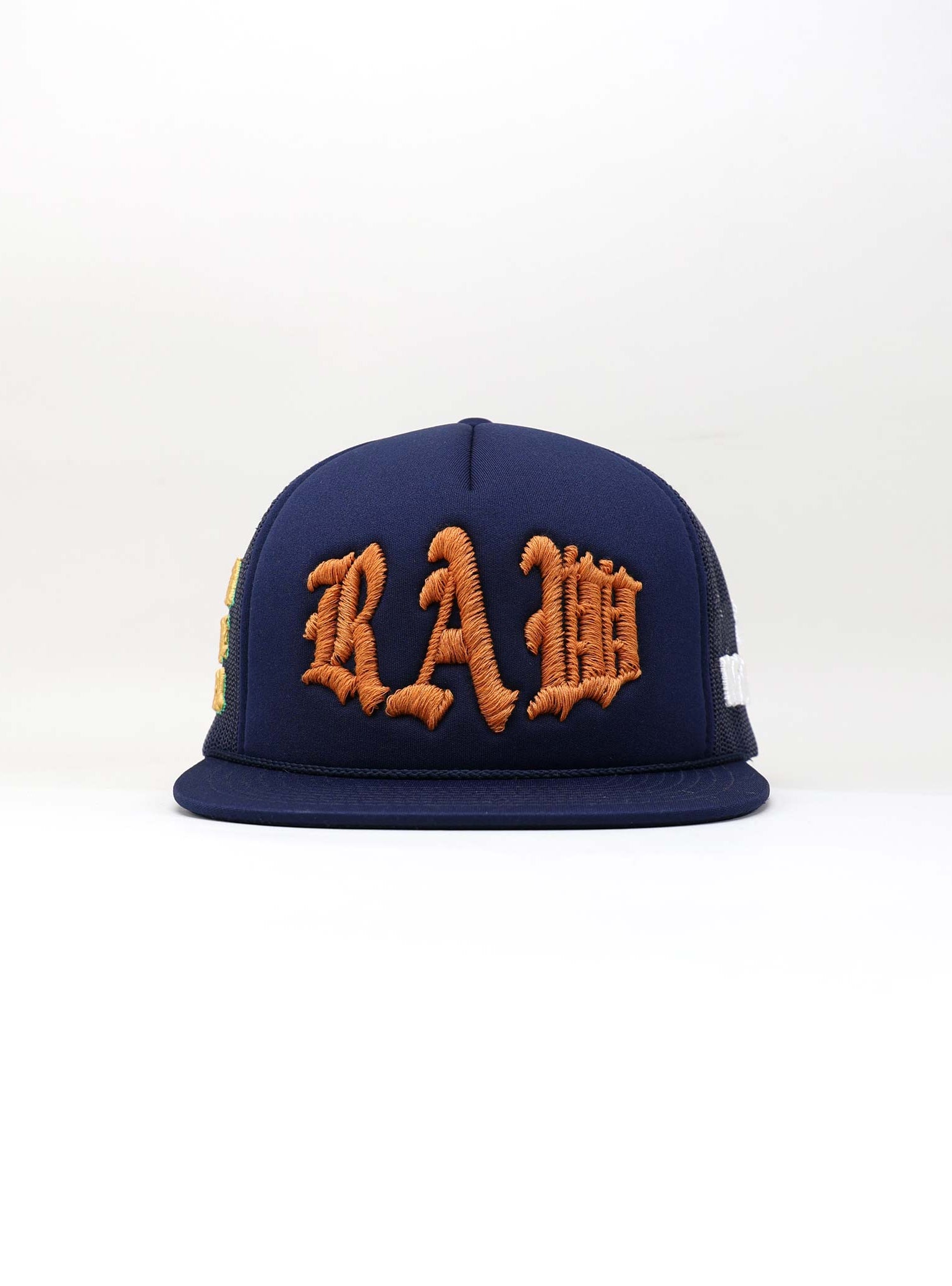 Embroidered in bold gold puff thread, the phrase “ART IS A CRIME” stretches across the mesh side. It’s a daring statement that questions conventions and elevates the cap beyond fashion into protest. The texture and placement amplify the message, turning the side panel into a wearable manifesto.