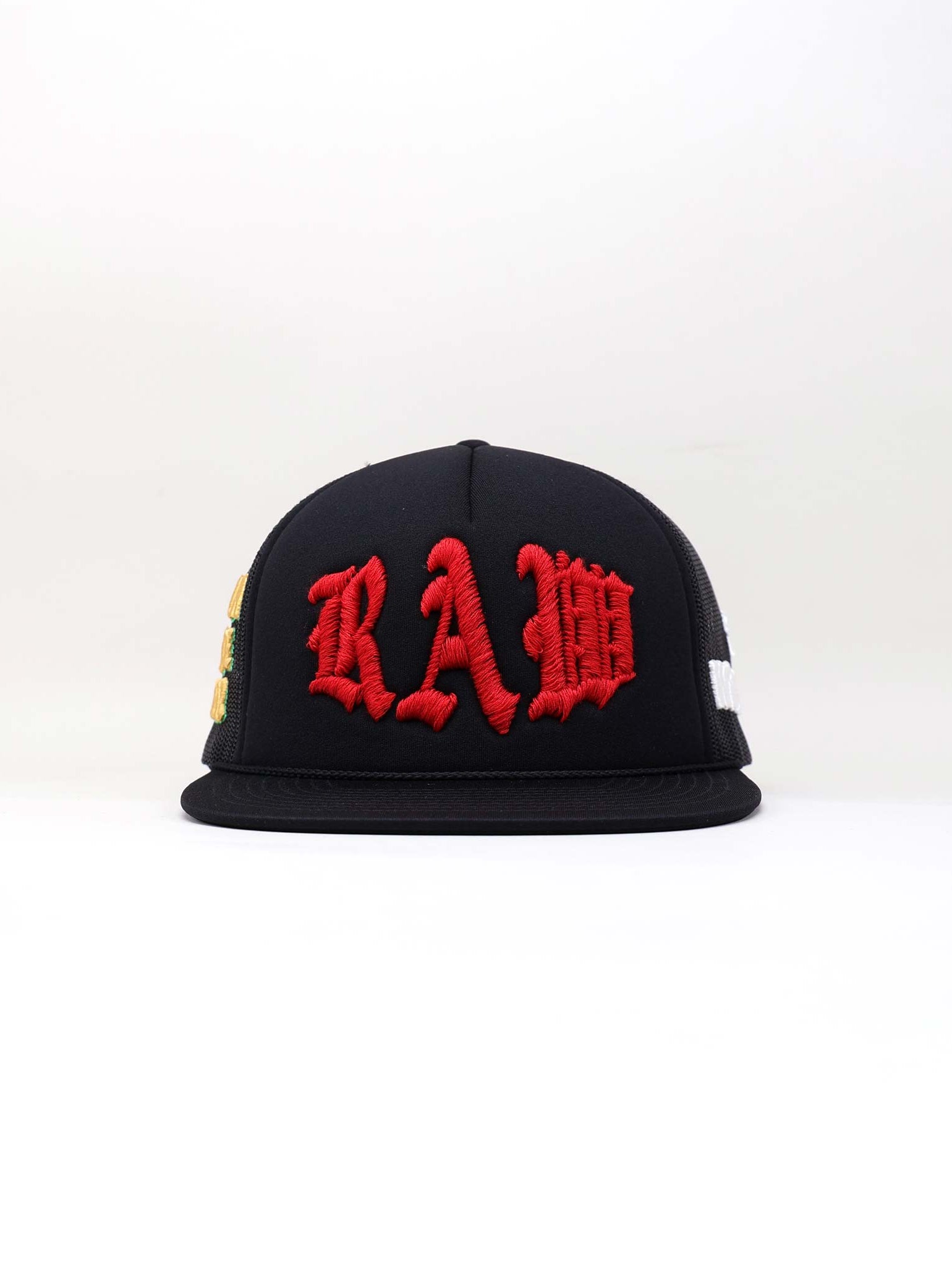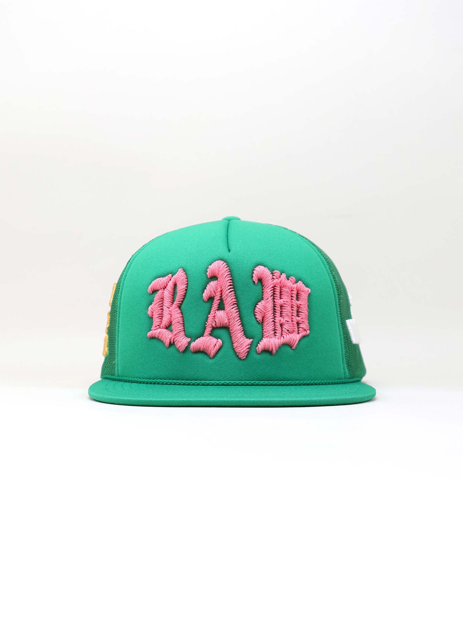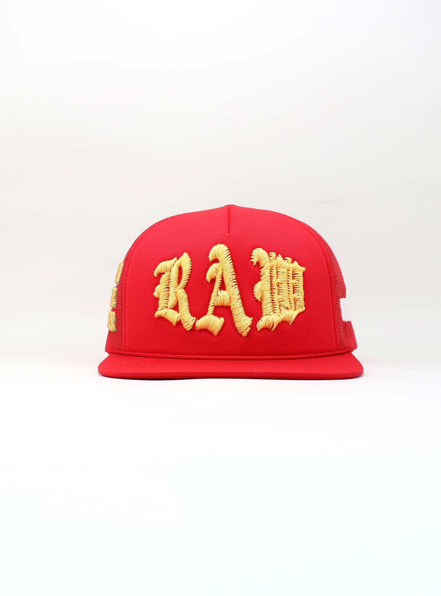 Embroidered in bold gold puff thread, the phrase “ART IS A CRIME” stretches across the mesh side. It’s a daring statement that questions conventions and elevates the cap beyond fashion into protest. The texture and placement amplify the message, turning the side panel into a wearable manifesto.