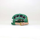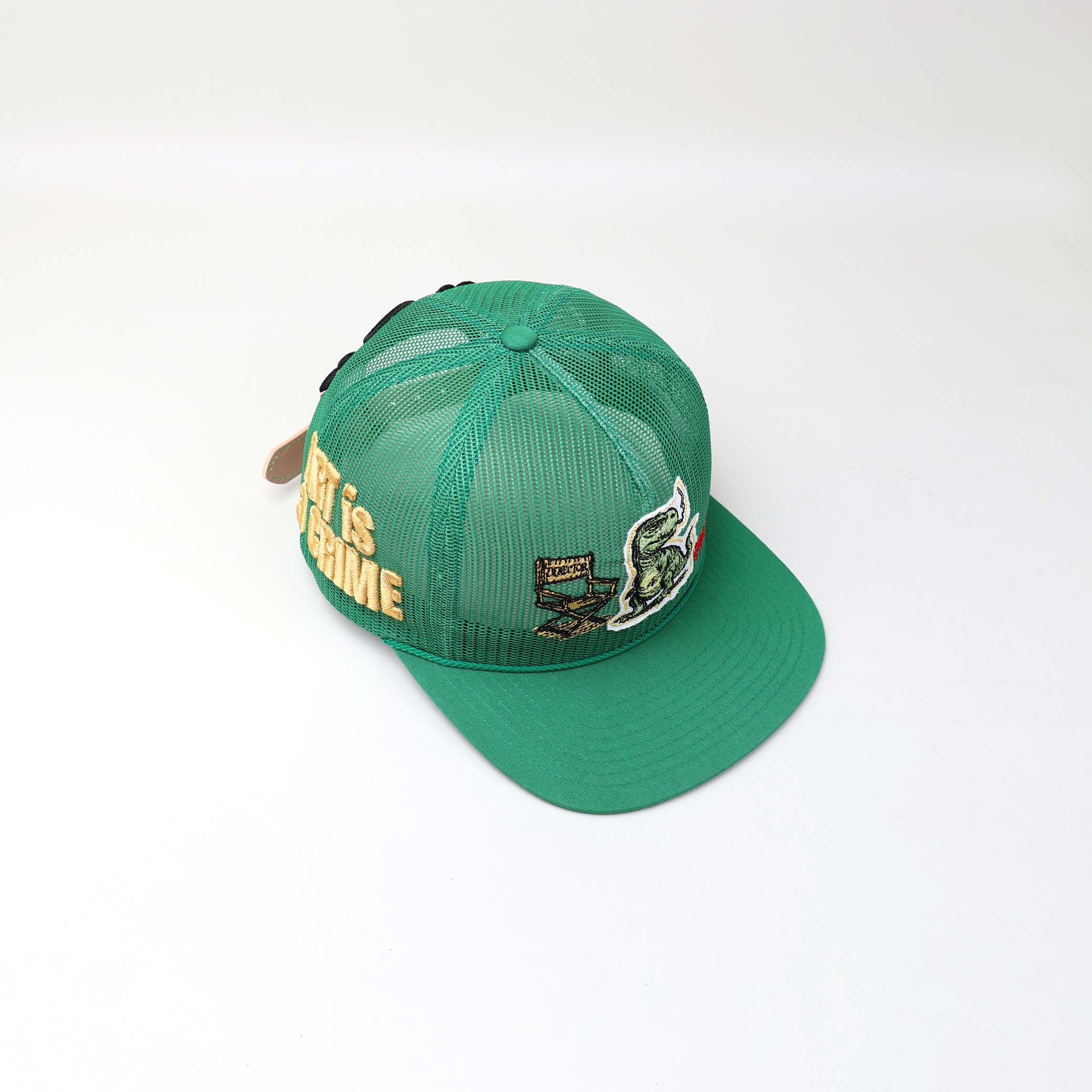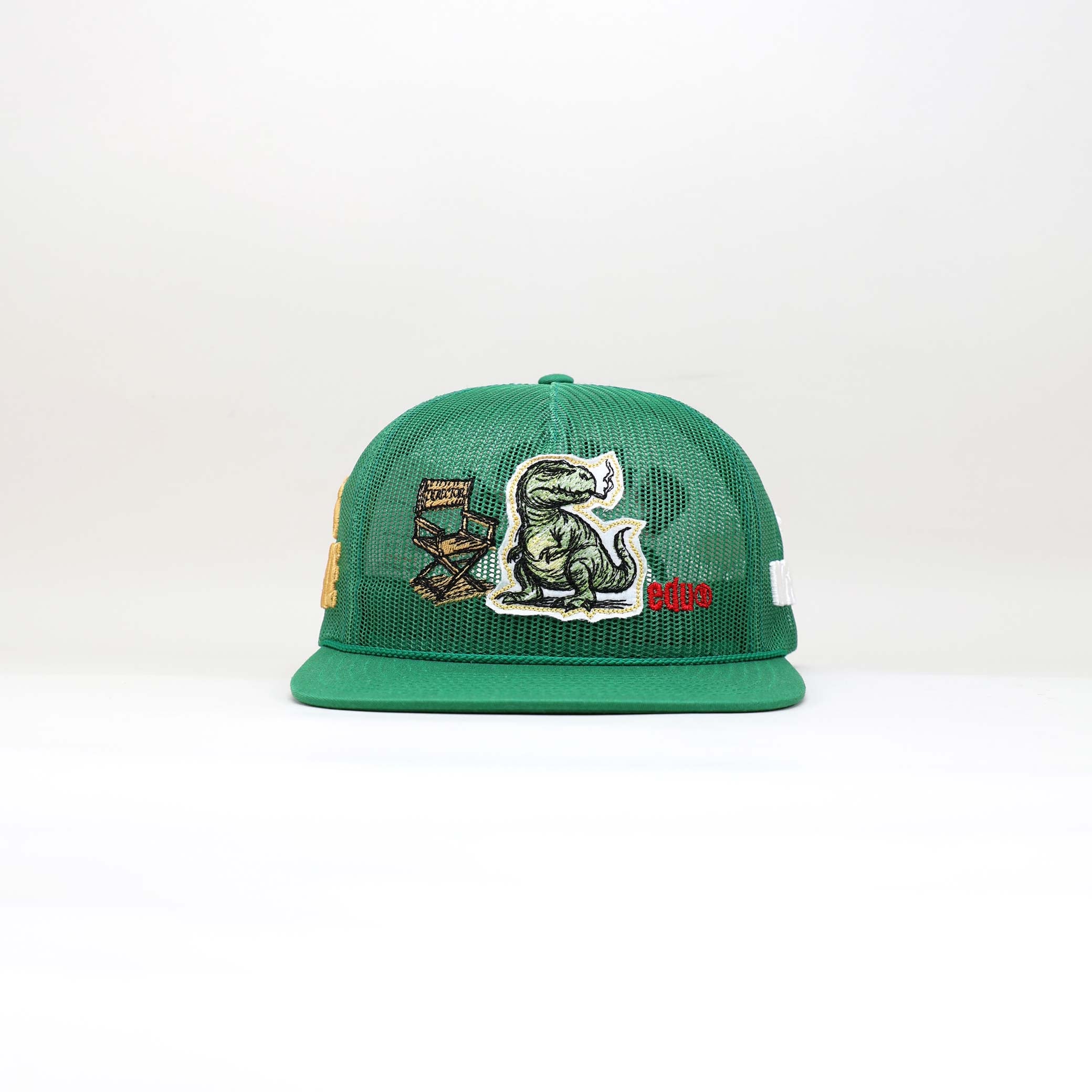 Fully mesh but fully expressive. A relaxed black mesh structure replaces the traditional foam panel, giving the front a breathable, lightweight silhouette. The centerpiece remains bold — a textured dinosaur appliqué stitched in earthy green, paired with a classic director’s chair marked “MIH™ HUMAN AGENCY.” The signature *edu logo is embroidered in vivid red, grounding the design with purpose.