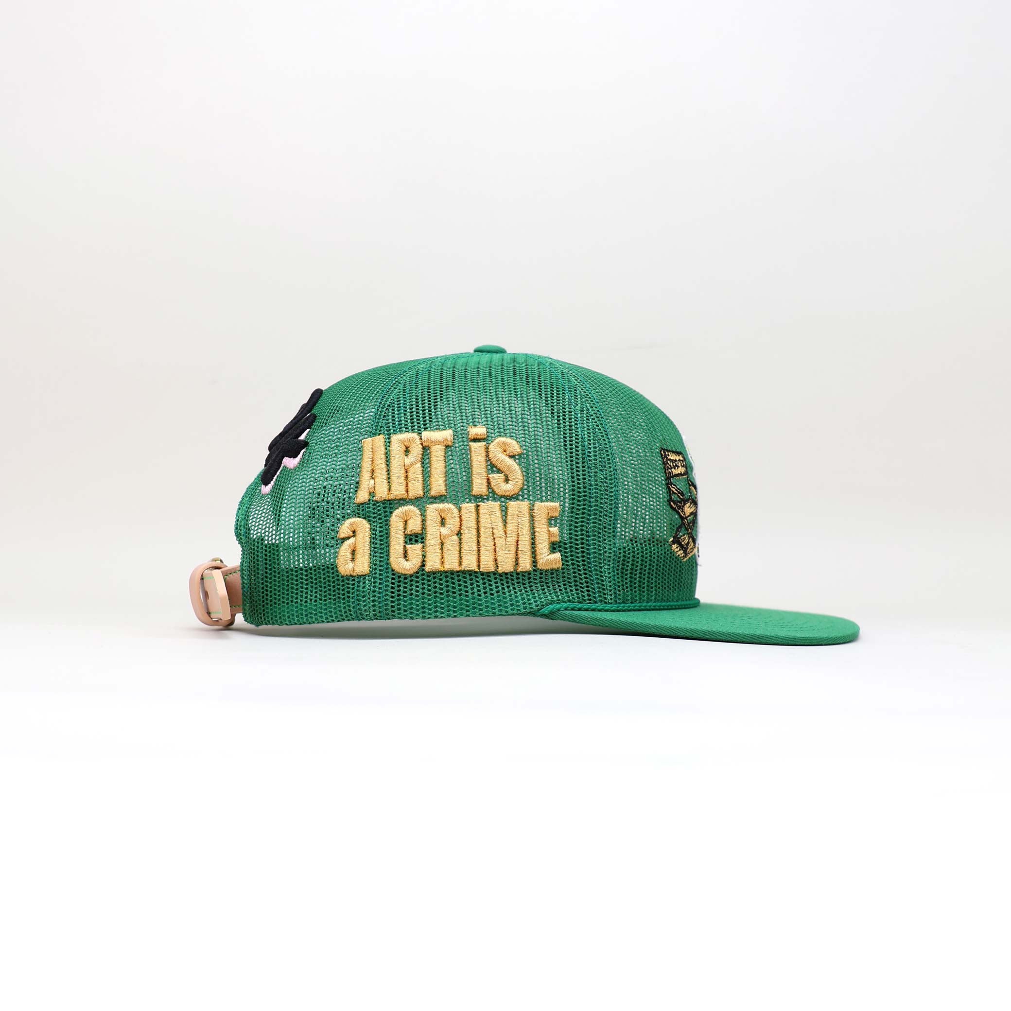 Puff embroidery in deep mustard spells out “ART IS A CRIME,” a visual battle cry against creative censorship. The lettering punches through the mesh, blending protest with presence.