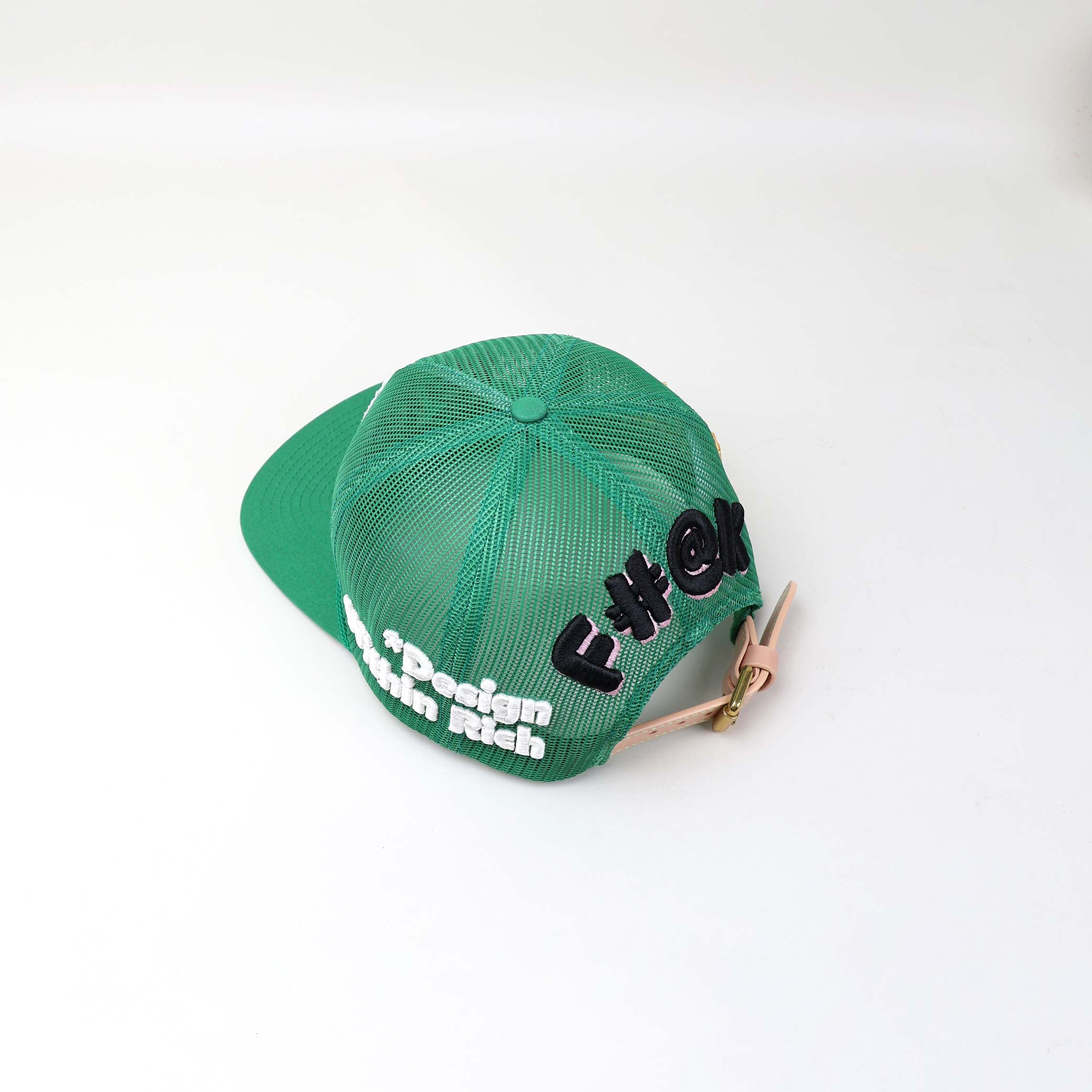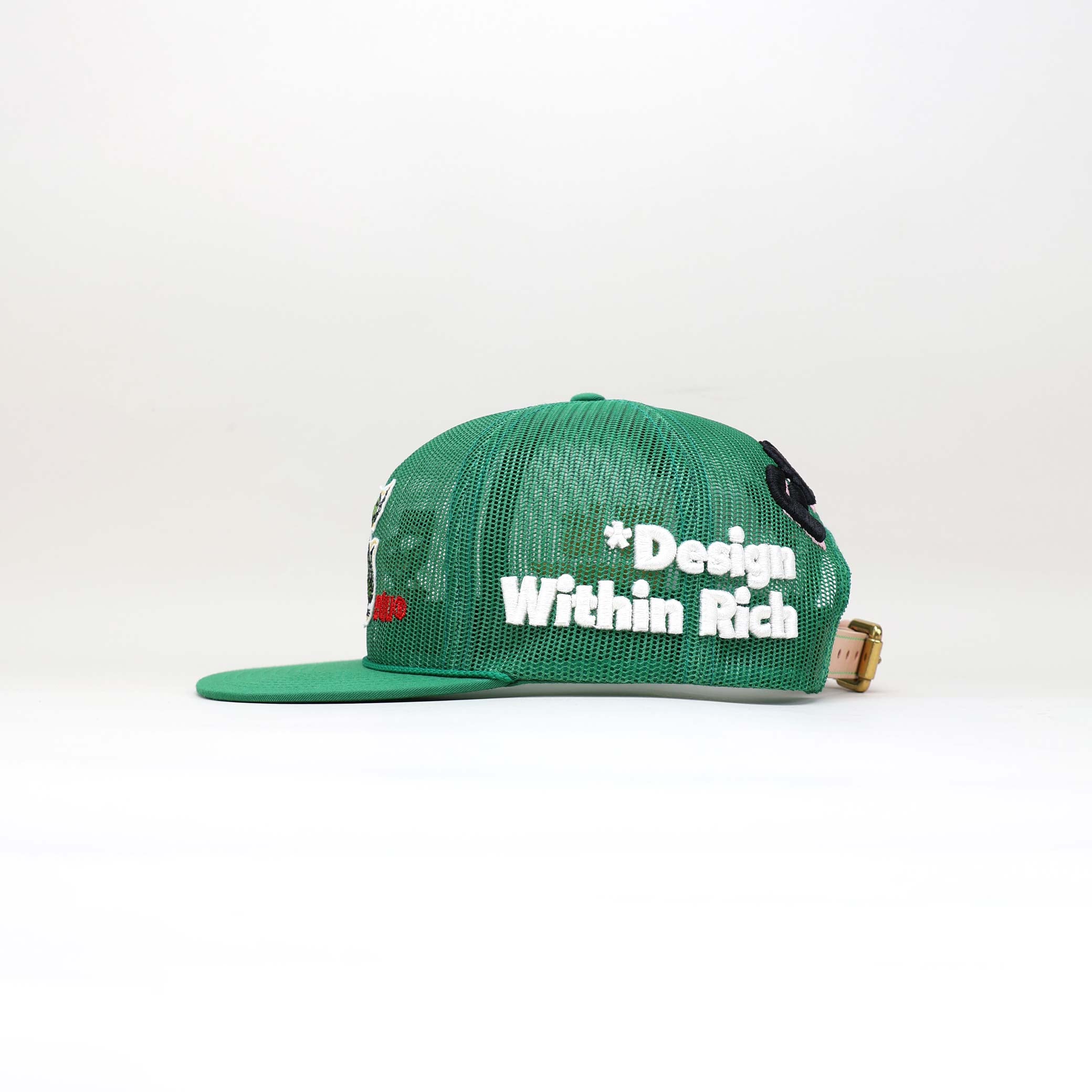 Crisp white embroidery reads “*Design Within Rich,” a recurring statement from the collection, reminding us that true wealth comes from within. The mesh backdrop adds depth and shadow, making the typography pop with understated strength.