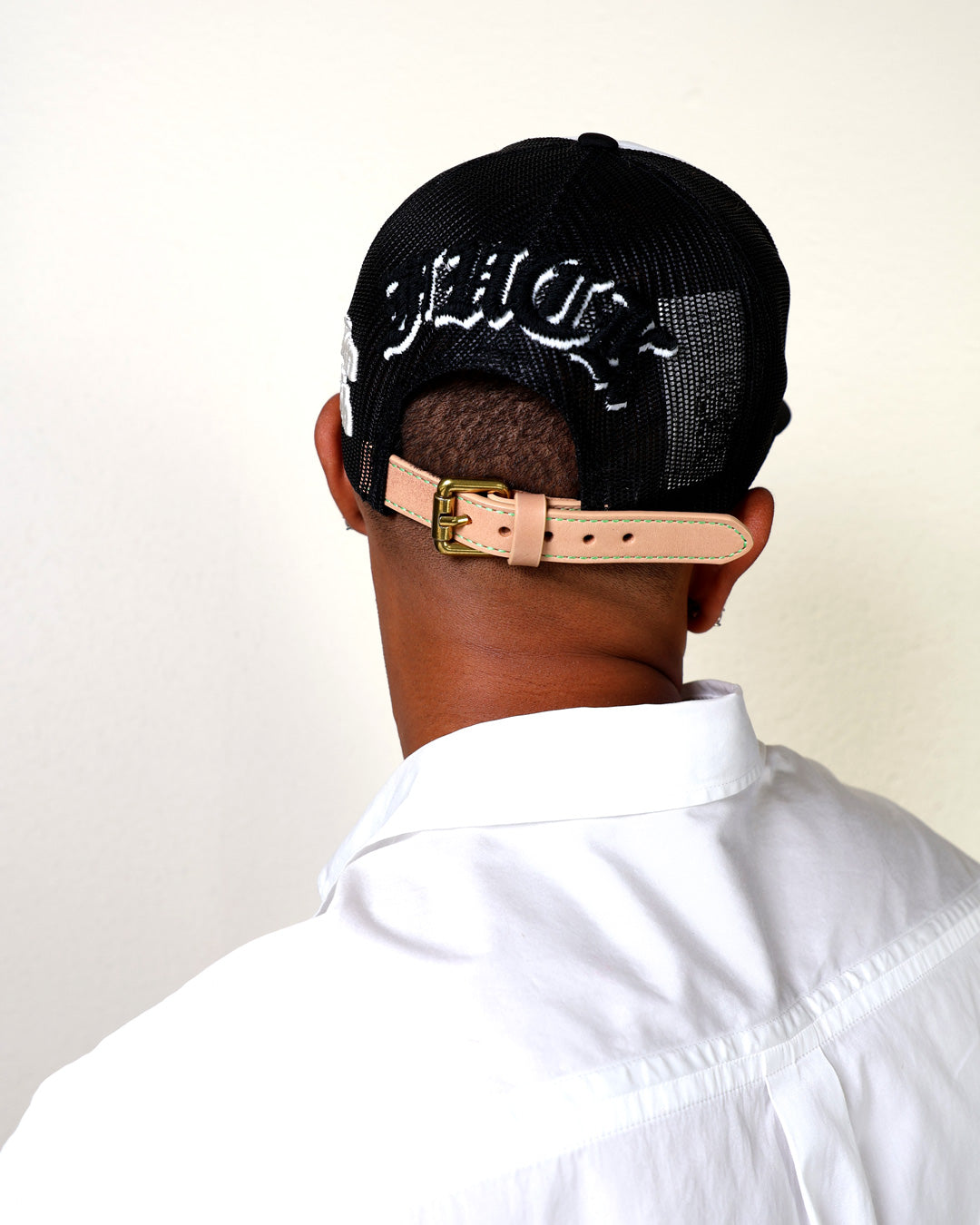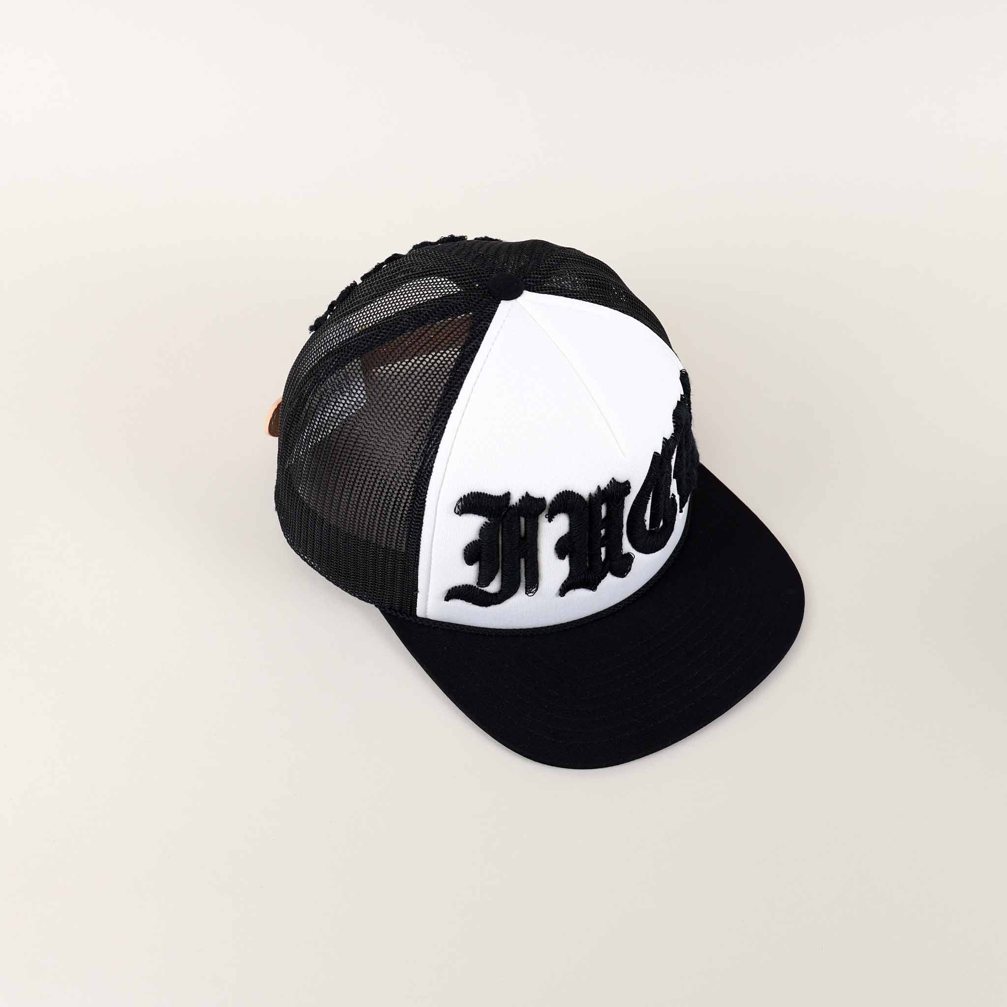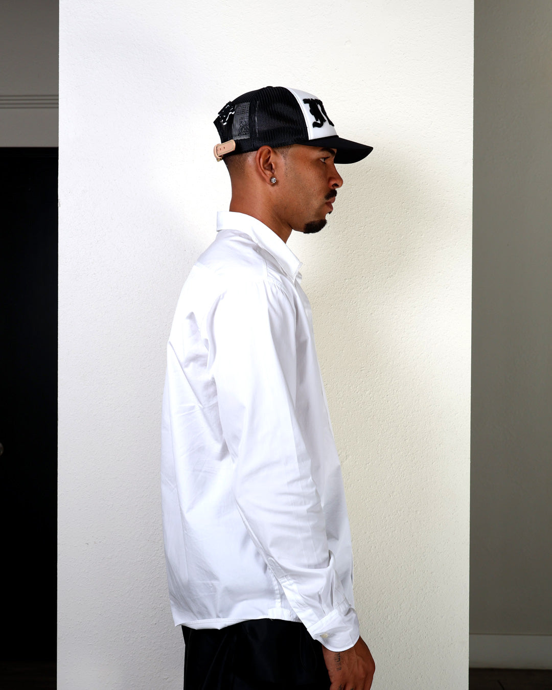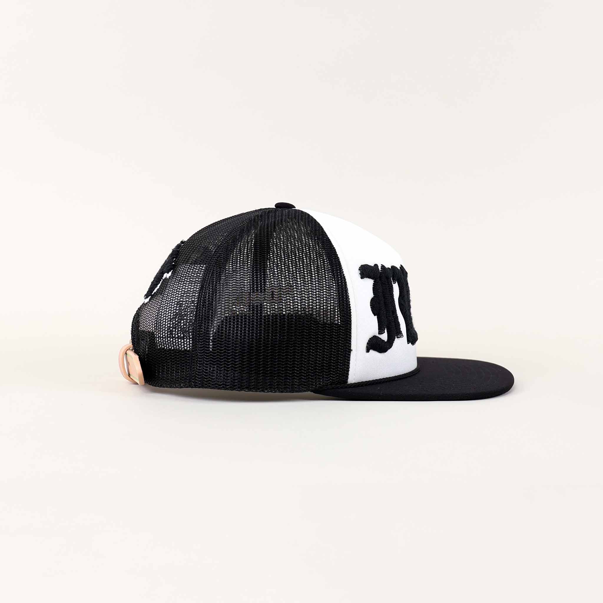 Classic 5-panel foam trucker hat with flat bill, breathable mesh, and an adjustable full-grain Argentine leather strap. Finished with raised Distressed embroidery and a loose threaded finish for a raw edge, bold unapologetic and made in USA.
