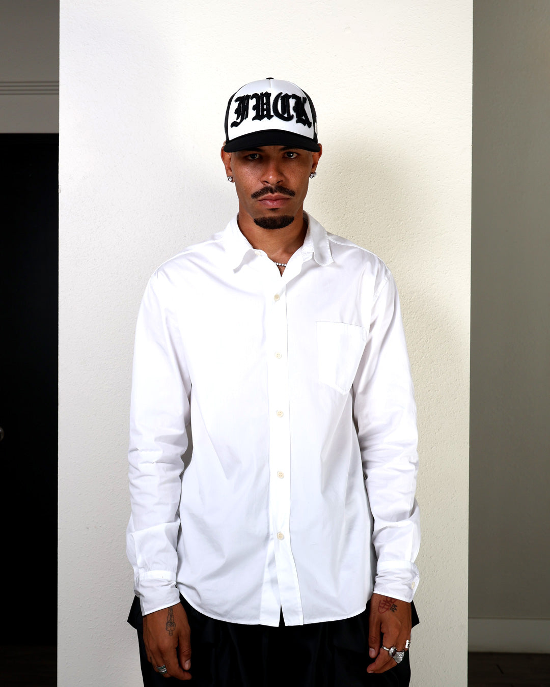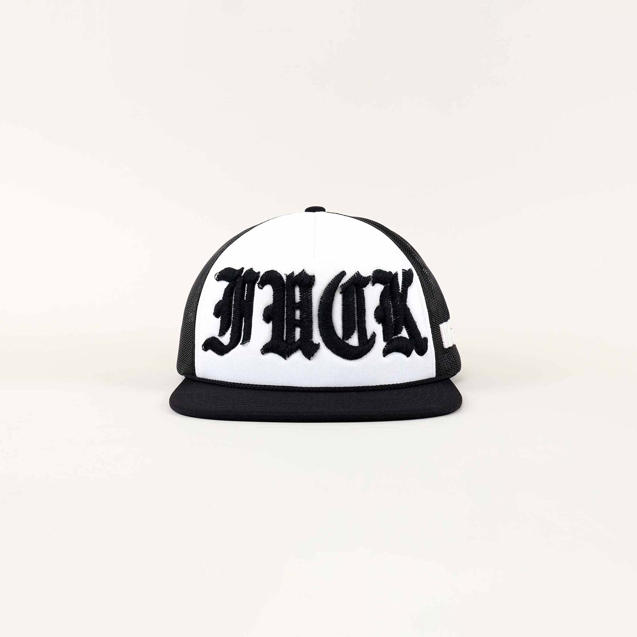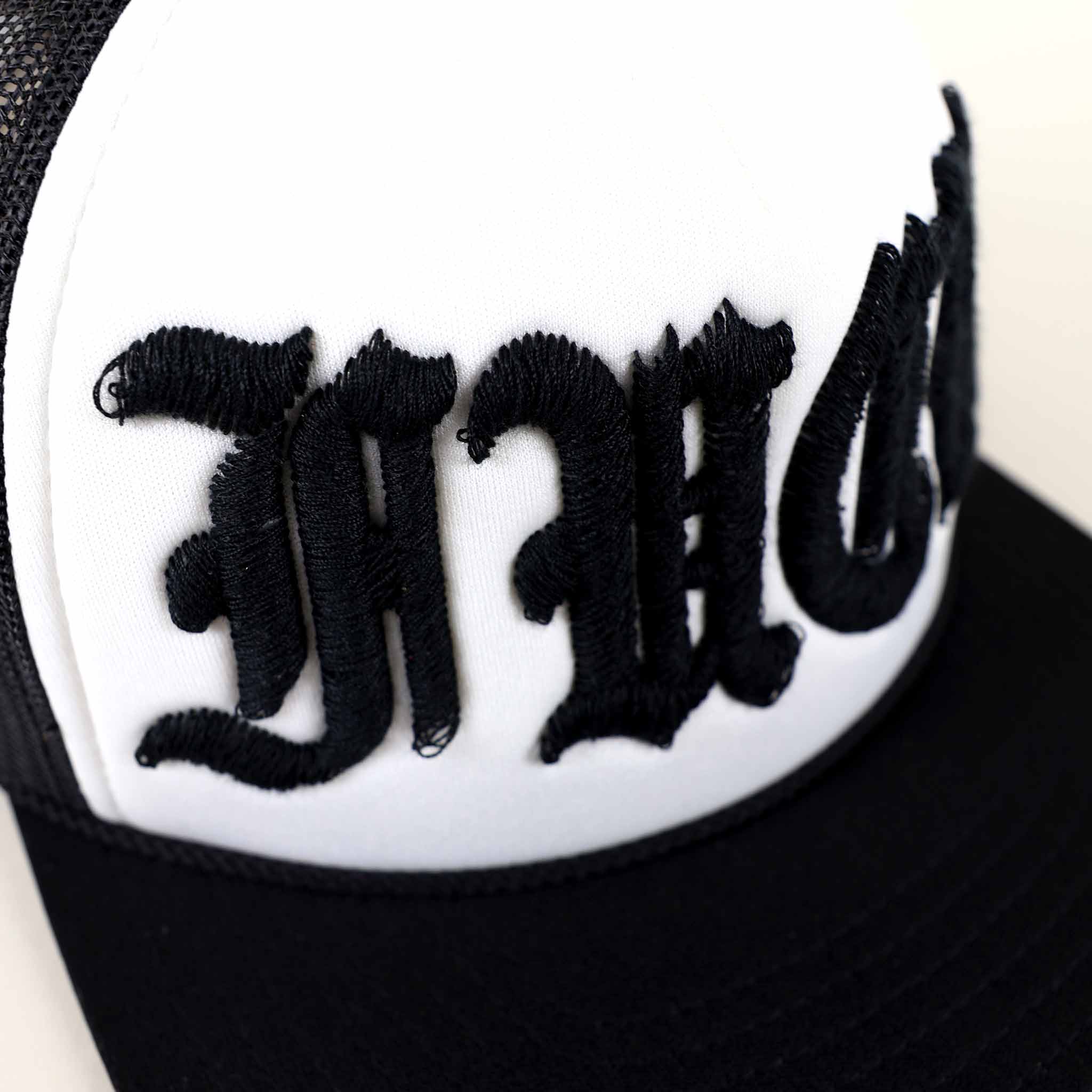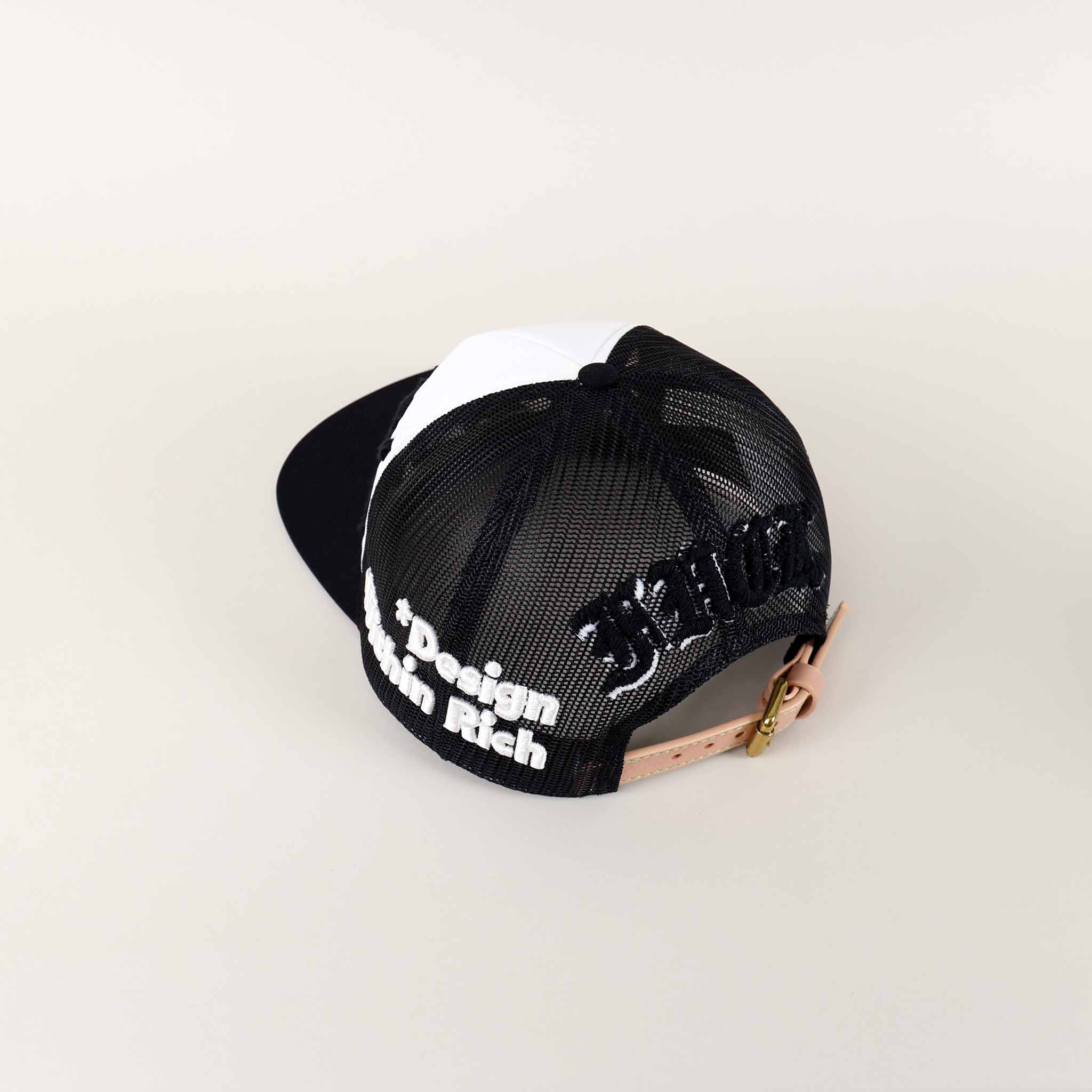Classic 5-panel foam trucker hat with flat bill, breathable mesh, and an adjustable full-grain Argentine leather strap. Finished with raised Distressed embroidery and a loose threaded finish for a raw edge, bold unapologetic and made in USA.