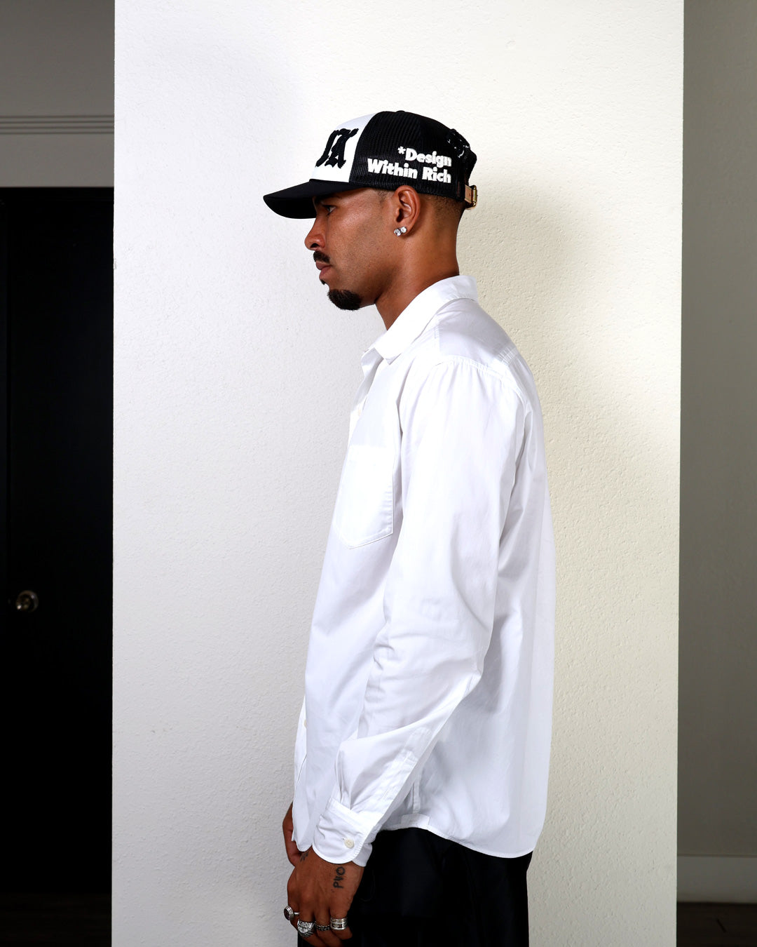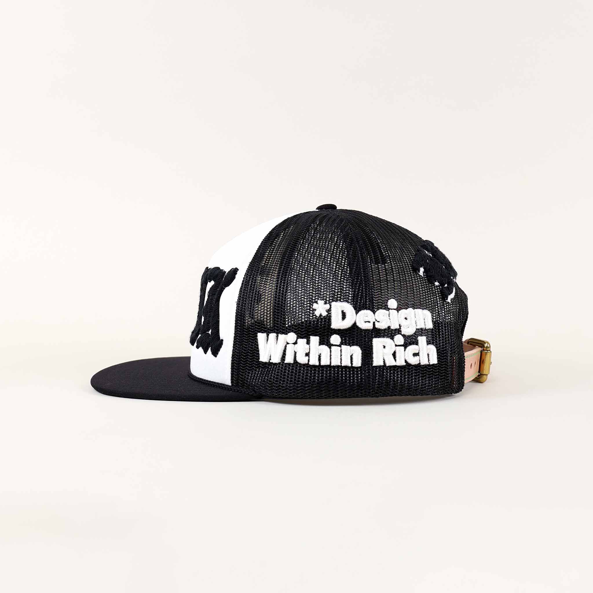 White embroidery reads “Design Within Rich” — a statement on finding creativity and meaning beyond surface wealth.