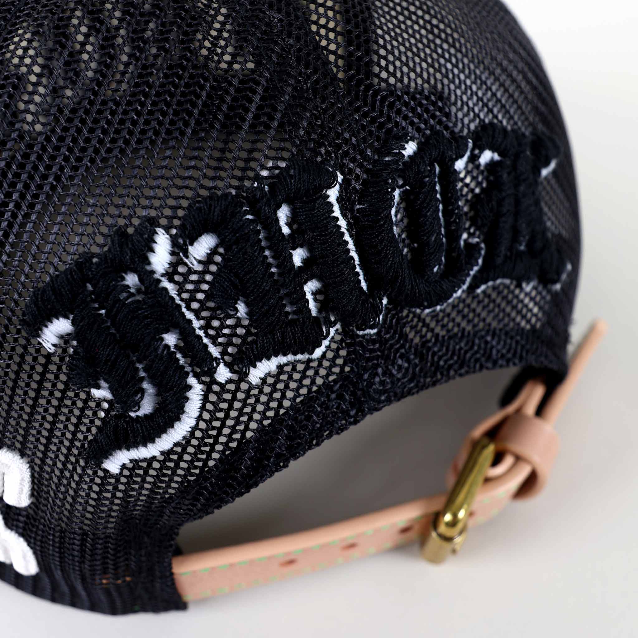 Mirrored embroidery of “FUCK” across the mesh, visible above an adjustable full-grain Argentine leather strap, blending rebellious edge with luxury craftsmanship.