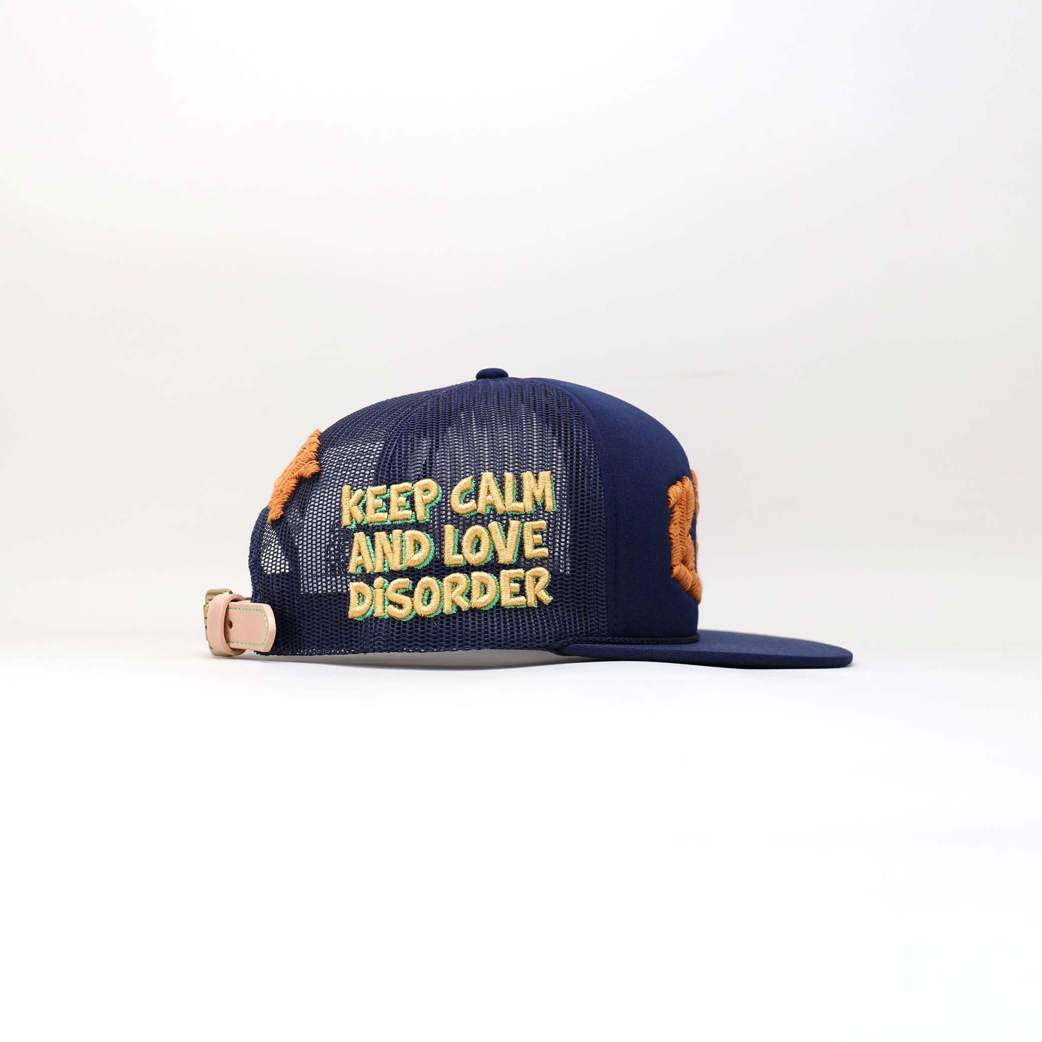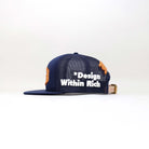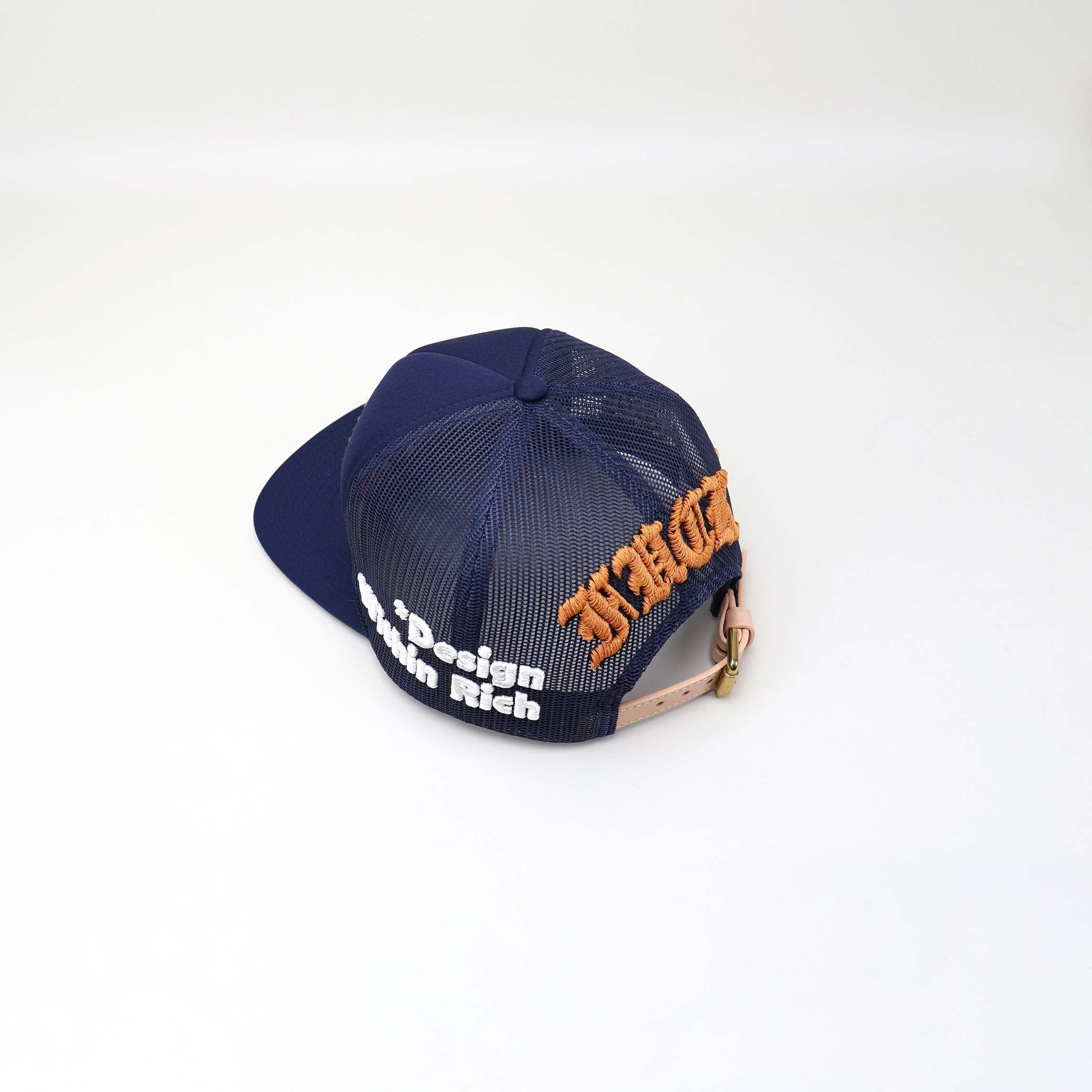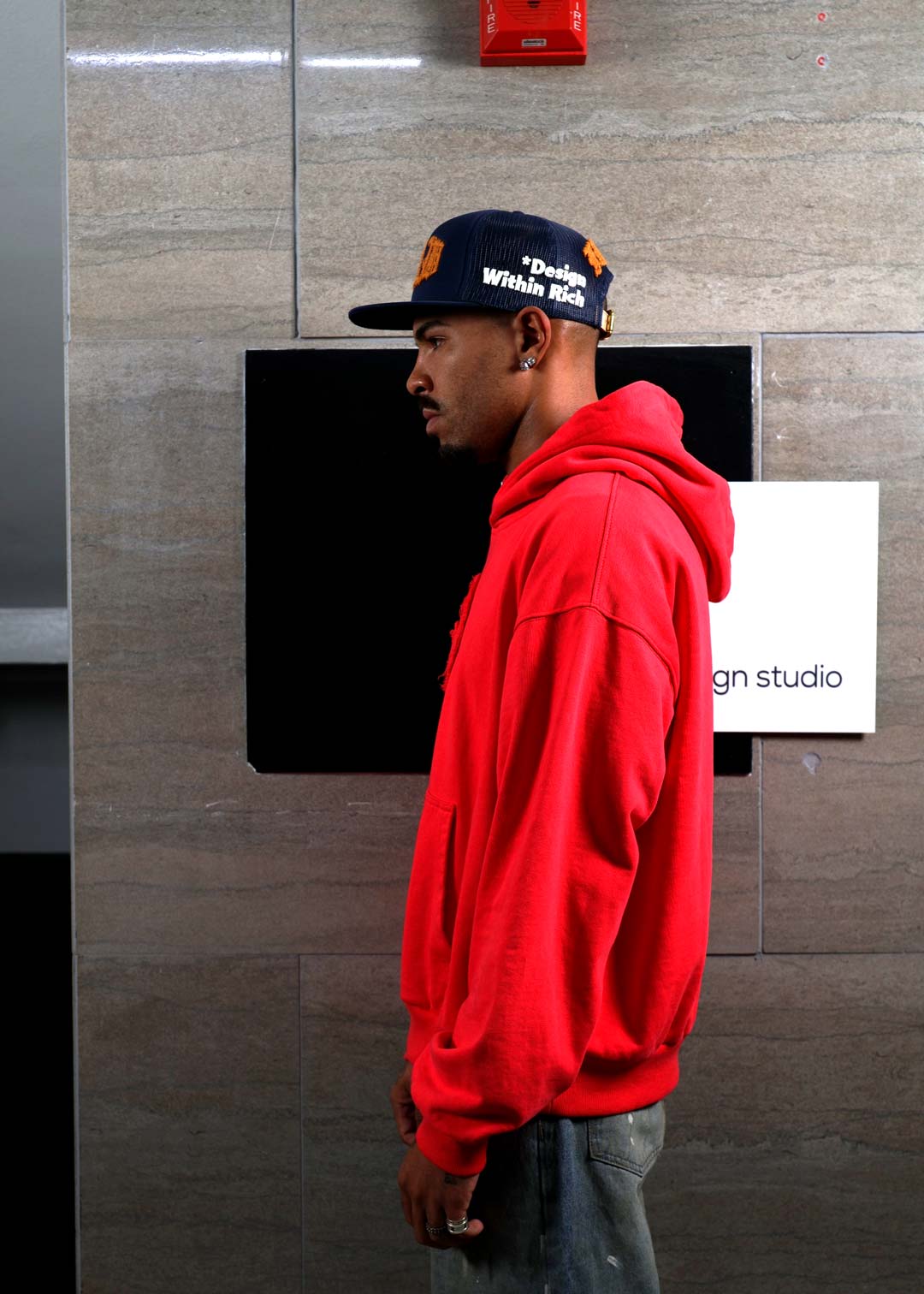 White raised embroidery reading *“Design Within Rich” on black mesh.