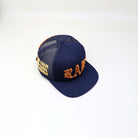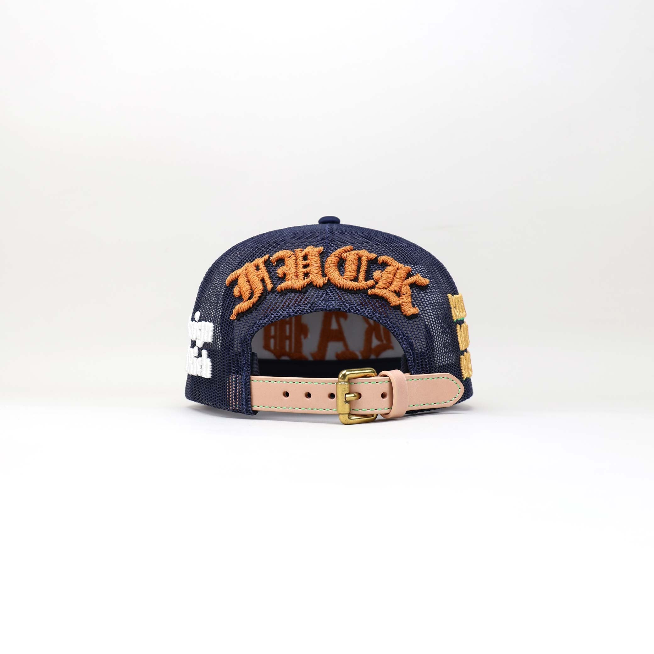 Classic 5-panel trucker hat features a raised, distressed, loose-threaded finish, a flat bill, and a full-grain Argentine leather strap. Made in USA.
