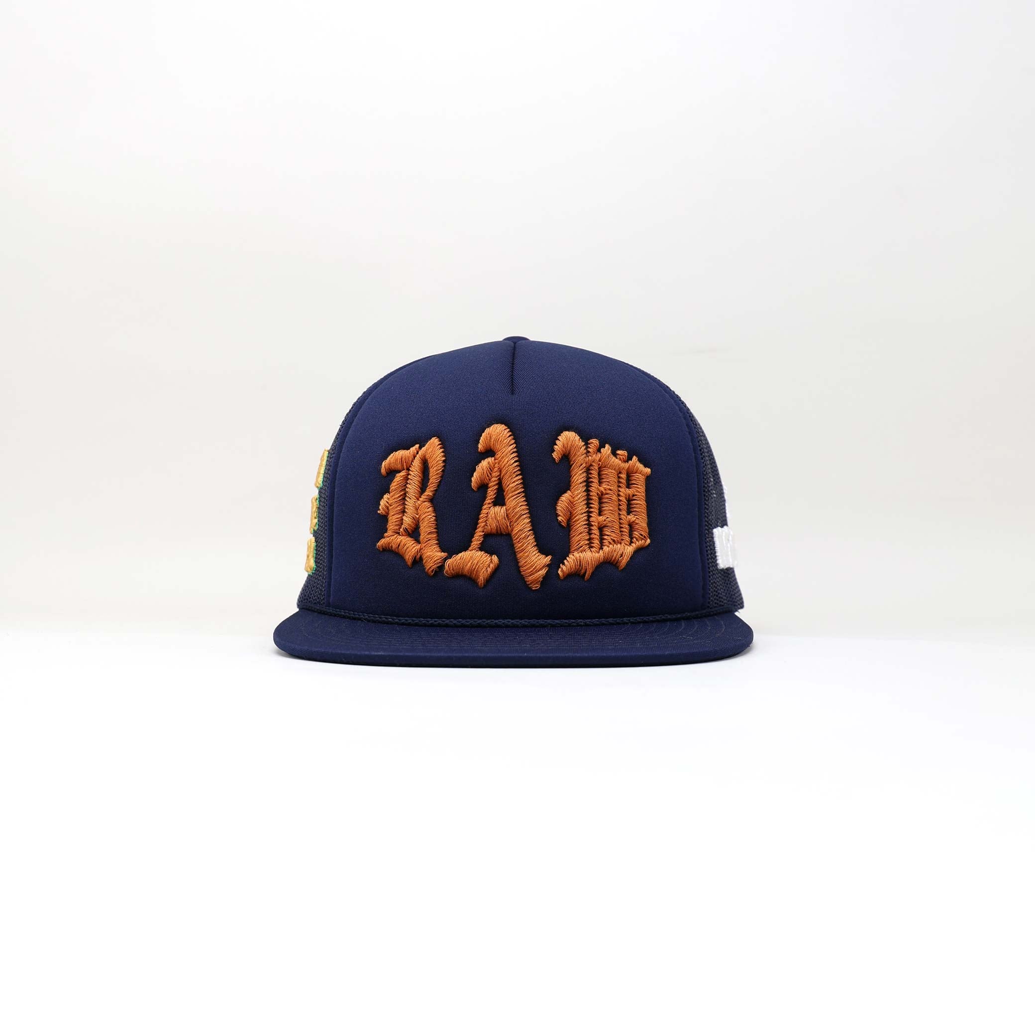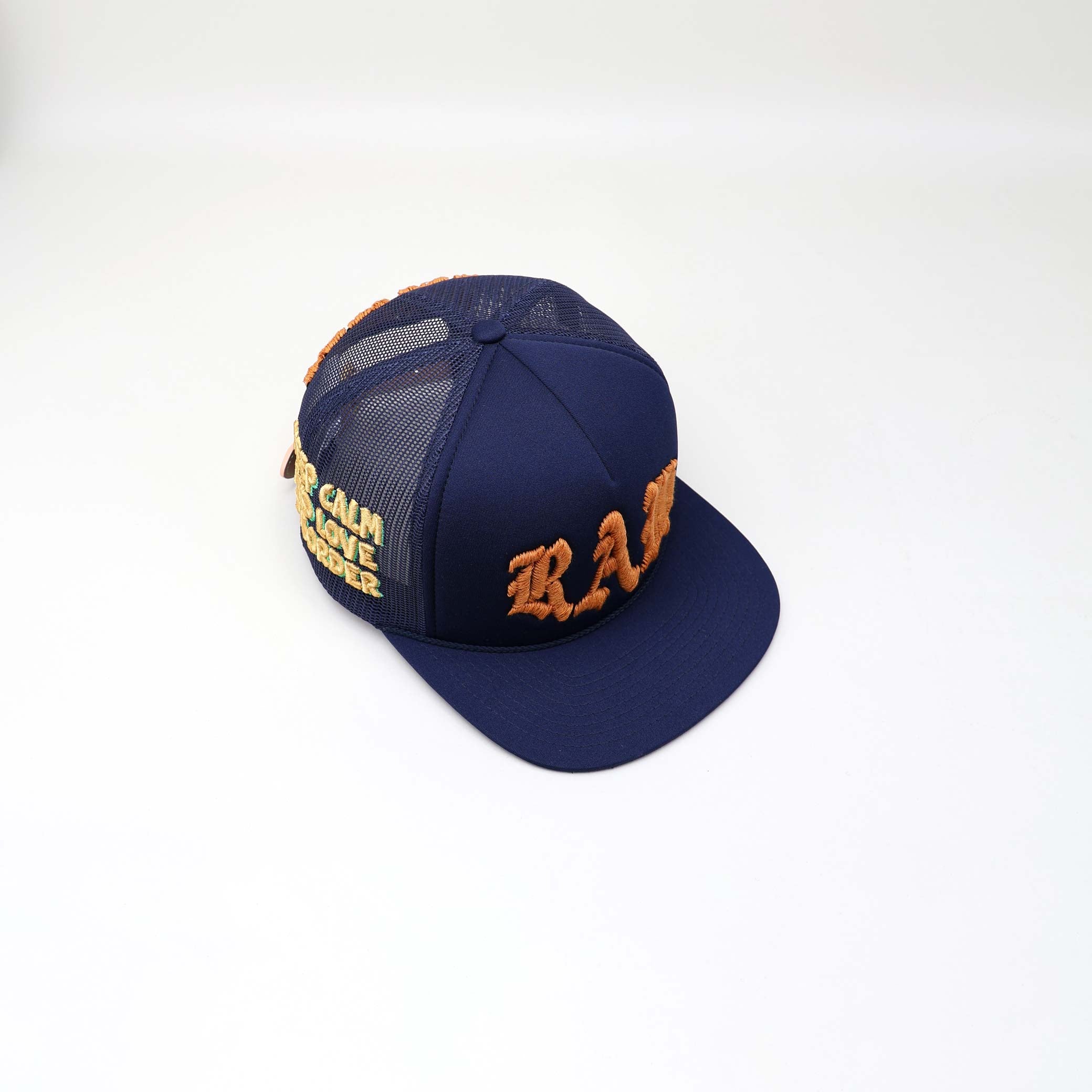 Bold 3D puff embroidery in black spelling “RAW” across a crisp white foam front panel.