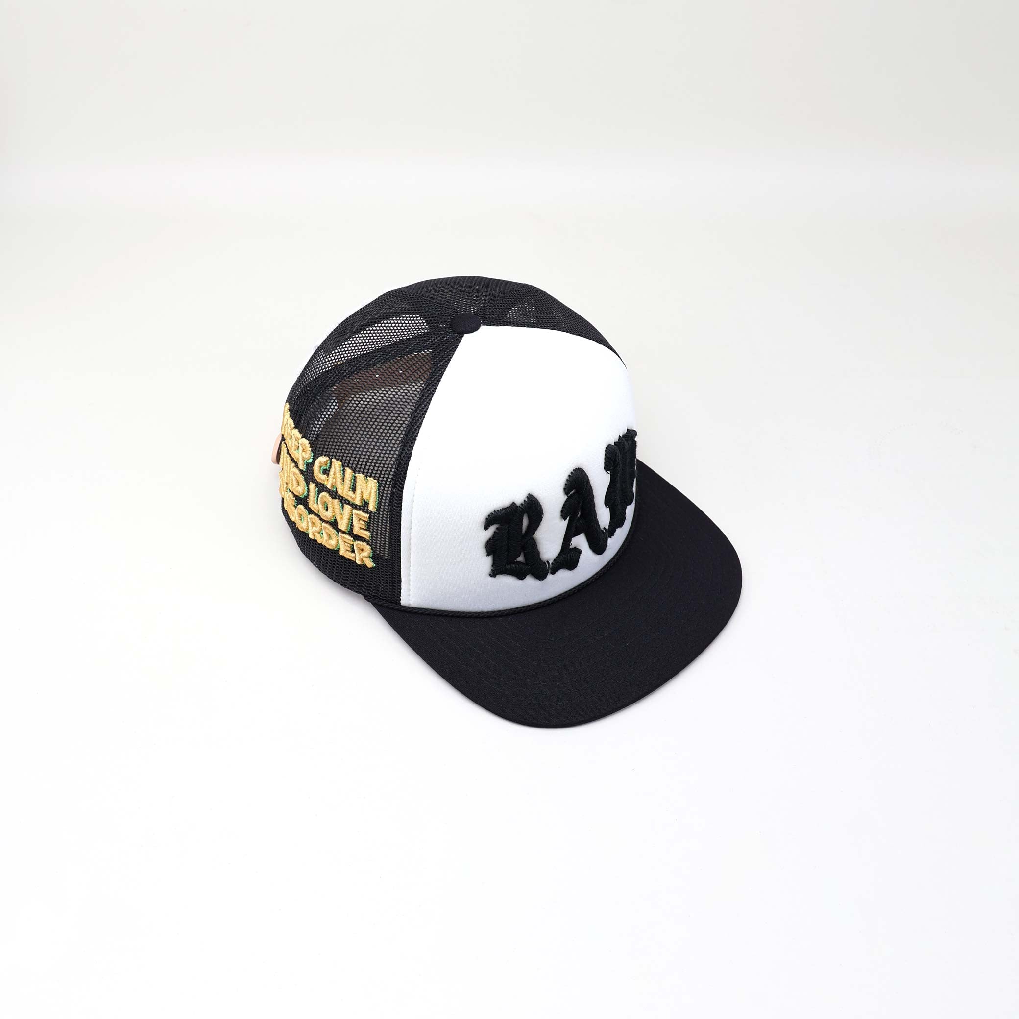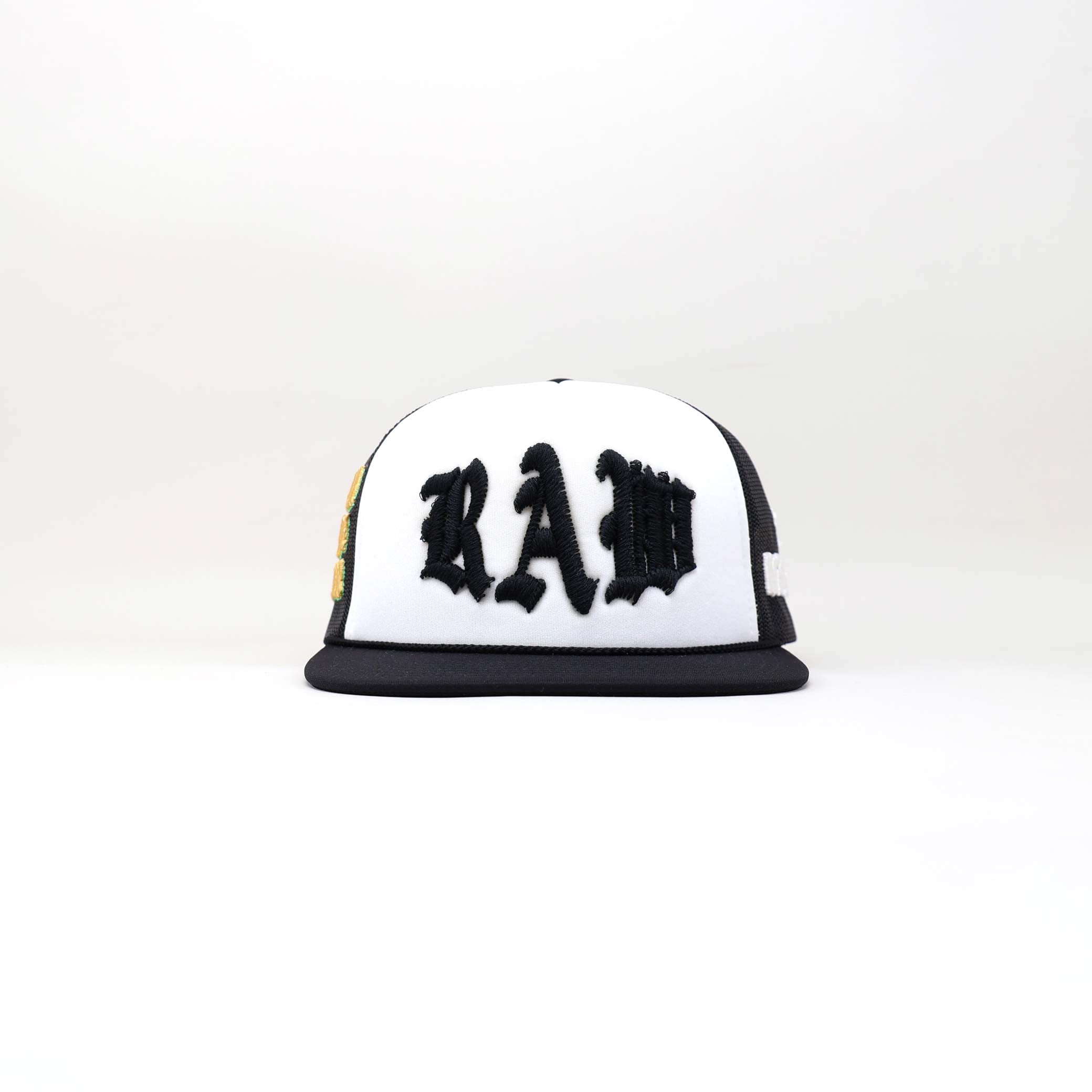 Bold 3D puff embroidery in black spelling “RAW” across a crisp white foam front panel.