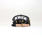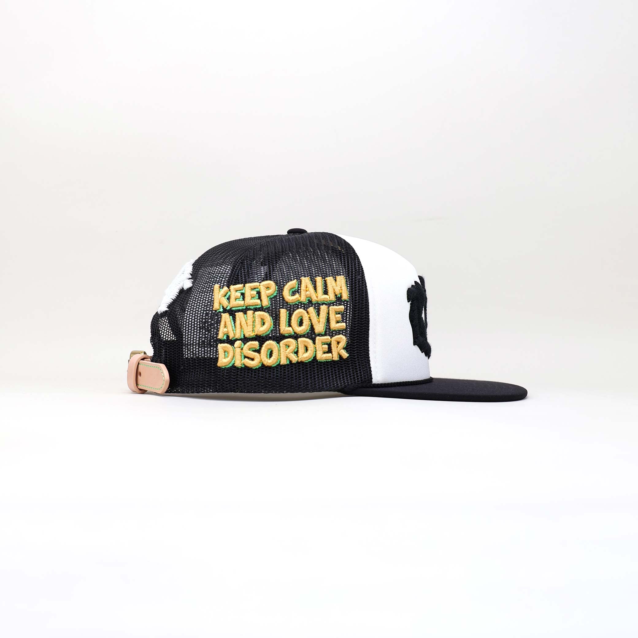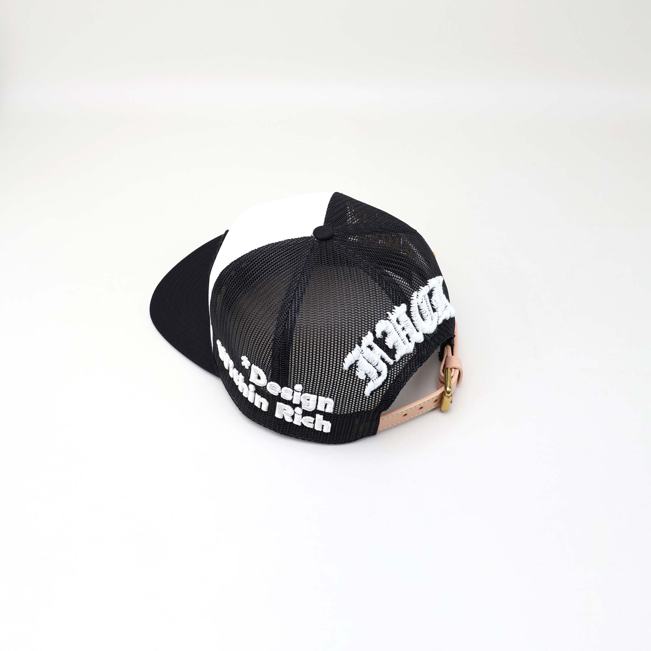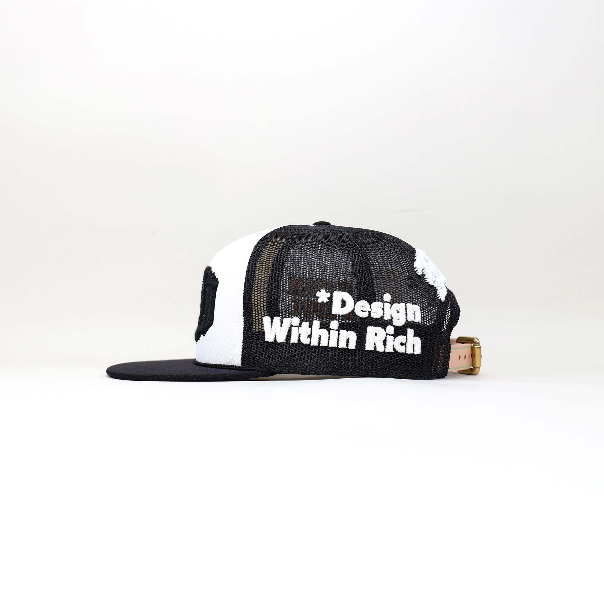 White raised embroidery reading *“Design Within Rich” on black mesh.