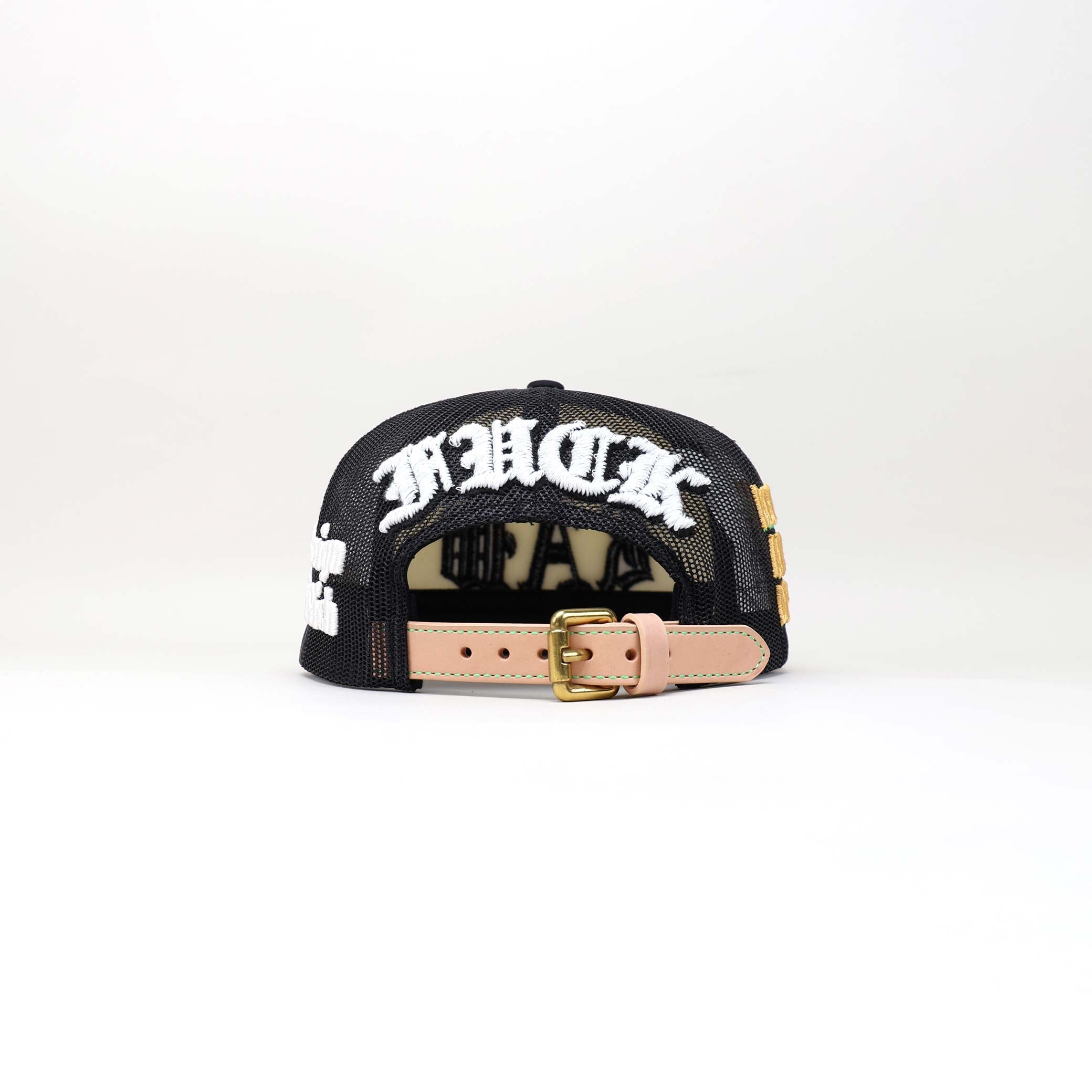 Bold 3D puff embroidery spelling “FUCK” in white Gothic font.